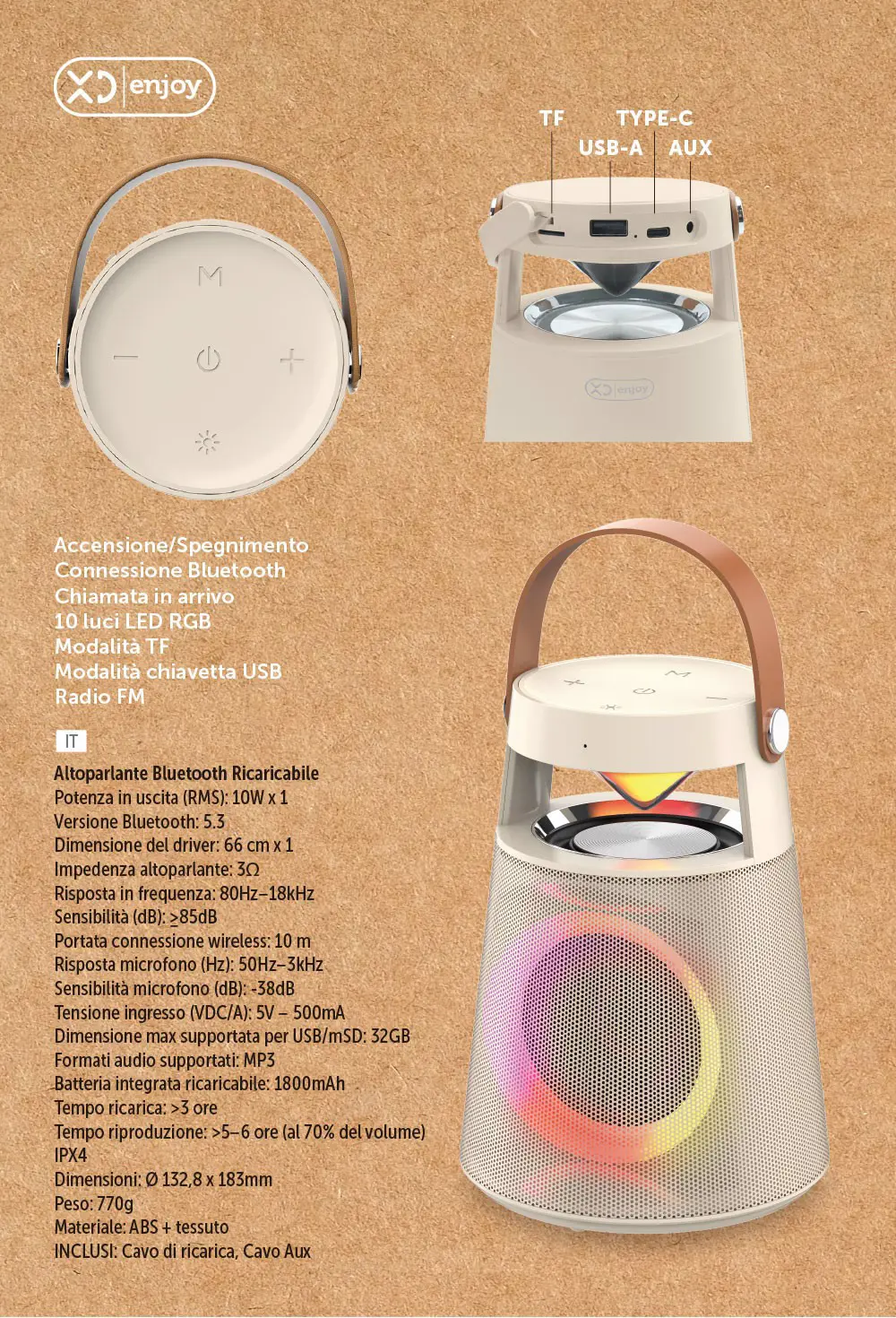 XD Enjoy Altoparlante Bluetooth Ricaricabile Portatile, 6,6 cm, 10 W, 80 - 18000 Hz, 3 Ω, 85 dB, Con cavo e senza cavo