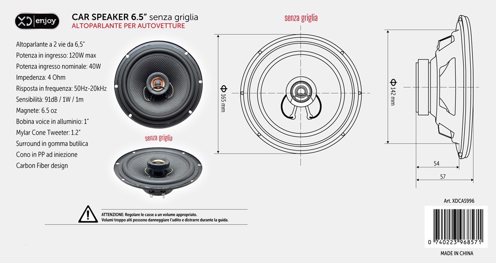 XD Enjoy XDCAS996, 2-vie, 120 W, 40 W, 4 Ω, 91 dB, 50 - 20000 Hz