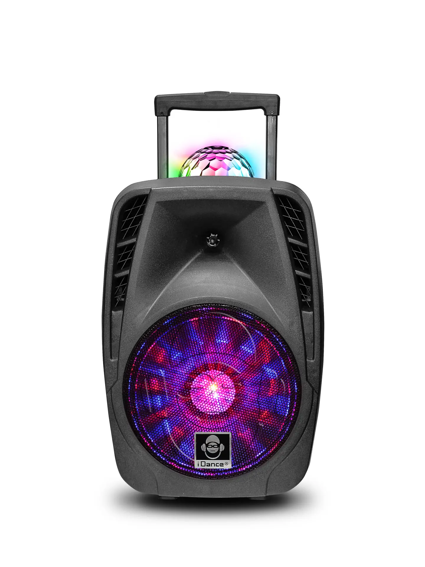 Sistema woofer da 100 watt max - 8" - 2 vie Robusto design in ABS con manico telescopico + ruote Leggero Facile da spostare Disco Ball che proiettano motivi su pareti e soffitto Illuminazione a led RGB da discoteca integrata nel woofer Riproduzione USB MP3 Riproduzione senza fili Bluetooth 2-4 ore di gioco con batteria ricaricabile Funzione radio FM 1 microfono cablato incluso con effetto ECHO Mixer integrato con microfono/chitarra, ingressi Aux in