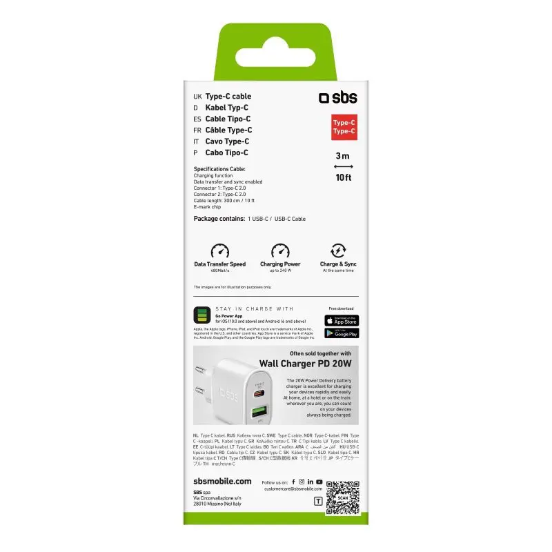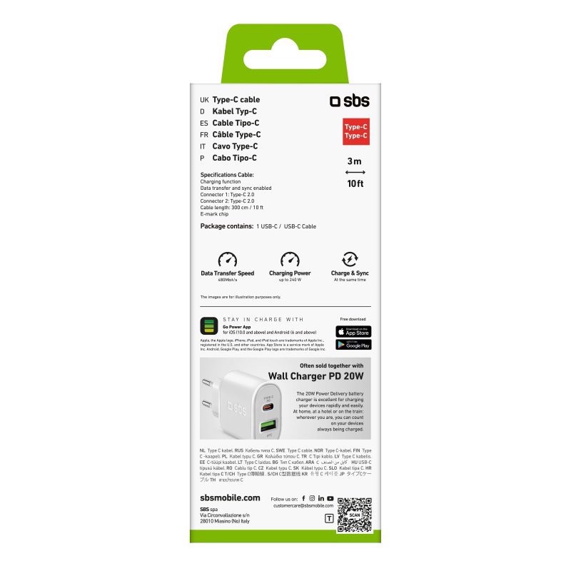 SBS TECABLE3MTCC240W, 3 m, USB C, USB C, USB 2.0, 480 Mbit/s, Bianco