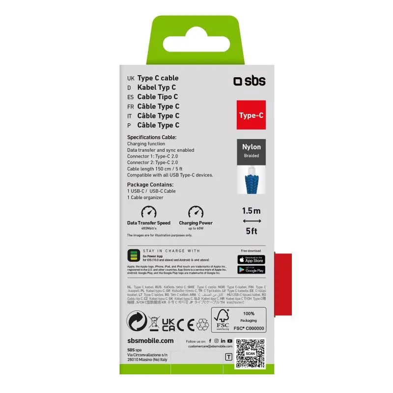 SBS TECABLETISSUETCCB, 1,5 m, USB C, USB C, USB 2.0, 480 Mbit/s, Blu