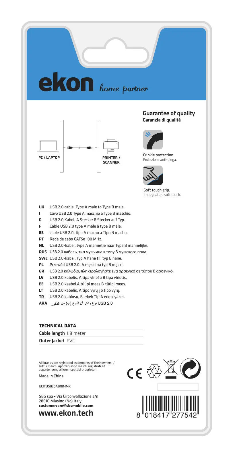 Il connettore USB 2.0 maschio di Tipo A è dedicato alla porta specifica del tuo pc, mentre l’estremità di Tipo B si inserisce all’ingresso dedicato della stampante.