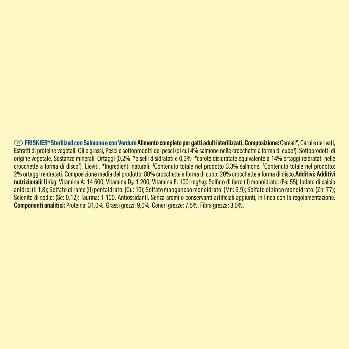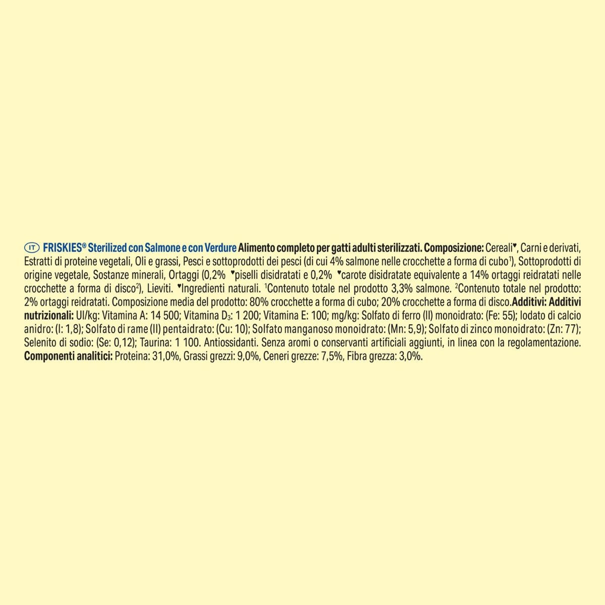 Noi di FRISKIES® sappiamo che hai a cuore il tuo pet e la sostenibilità. Nutrire il tuo gatto con FRISKIES® è una scelta di cui ti puoi fidare! Nutrizione di qualità, 100% completa e bilanciata, specifica per le esigenze del tuo gatto. Fatto con ingredienti naturali selezionati e senza coloranti. PURINA FRISKIES® Sterilized è una ricetta specificamente formulata per fornire al tuo gatto sterilizzato tutti i nutrienti di cui ha bisogno. E' un alimento secco per gatti con salmone e con verdure. Composizione media del prodotto: 80% crocchette a forma di cubo; 20% crocchette a disco.