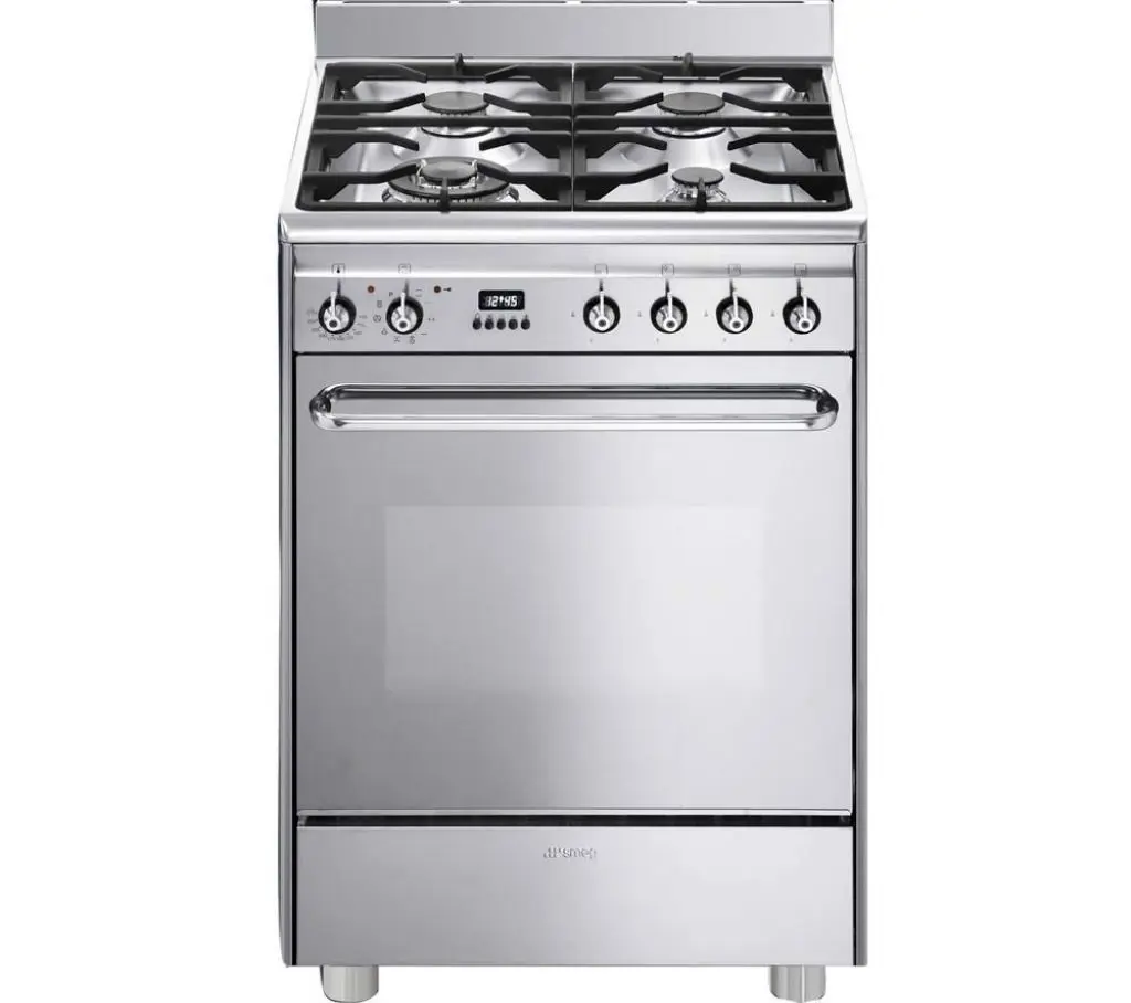 Smeg CP60X9. Tipo di prodotto: Piano cottura, Colore del prodotto: Acciaio inossidabile, Tipo di controllo: Manopola. Tipo di piano cottura: Gas, Numero totale elementi piano cottura: 4 Fornello(i), Tipo di superficie superiore: Acciaio inossidabile. Dimensione del forno: Media, Sorgente di alimentazione del forno: Elettrico, Capacità netta del forno: 70 L. Tipo di timer: Digitale. Classe efficienza energetica: A, Consumo energetico (convenzionale): 1,09 kWh, Tensione di ingresso AC: 220 - 240 V