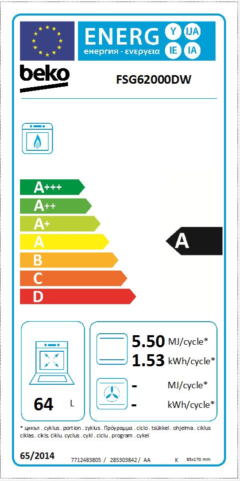 Beko FSG62000DW. Tipo di prodotto: Piano cottura, Colore del prodotto: Bianco, Tipo di controllo: Manopola. Tipo di piano cottura: Gas, Numero totale elementi piano cottura: 4 Fornello(i), Numero di fornelli: 4 Fornello(i). Dimensione del forno: Media, Sorgente di alimentazione del forno: Gas, Capacità netta del forno: 64 L. Classe efficienza energetica: A, Consumo energetico (convenzionale): 1,53 kWh, Consumo energetico (convenzionale): 5,5 MJ. Larghezza: 600 mm, Profondità: 600 mm, Altezza: 850 mm