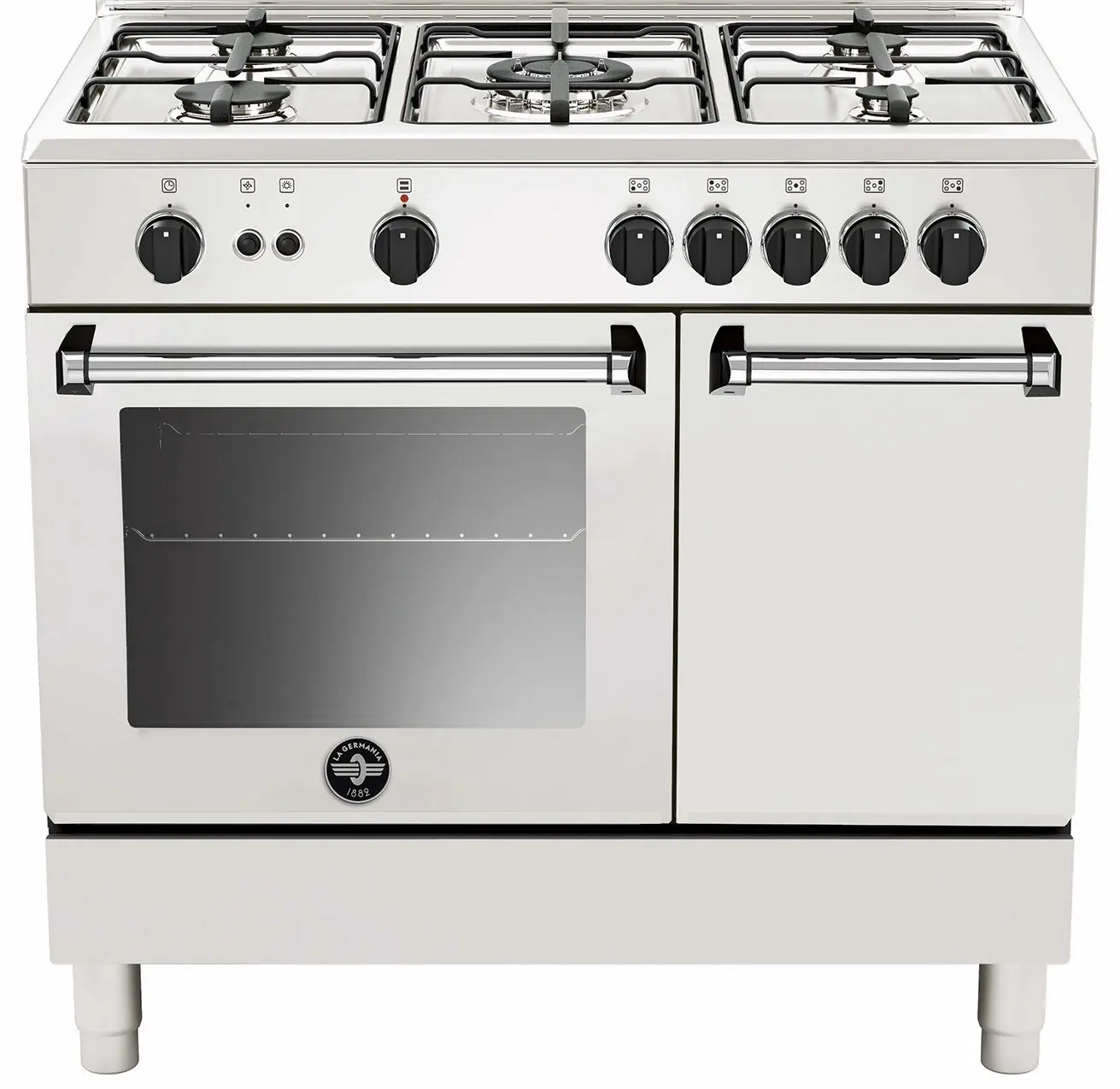 Bertazzoni La Germania Americana AMN9P5GBV/24. Tipo di prodotto: Cucina, Colore del prodotto: Bianco, Tipo di controllo: Manopola. Tipo di piano cottura: Gas, Numero totale di fuochi: 5 Fornello(i), Numero di fuochi: 5 Fornello(i). Dimensione del forno: Media, Sorgente di alimentazione del forno: Gas, Capacità netta del forno: 56 L. Classe efficienza energetica: A+, Consumo energetico (convenzionale): 1,3 kWh, Consumo energetico (convezione forzata): 1,49 kWh. Larghezza: 900 mm, Profondità: 600 mm