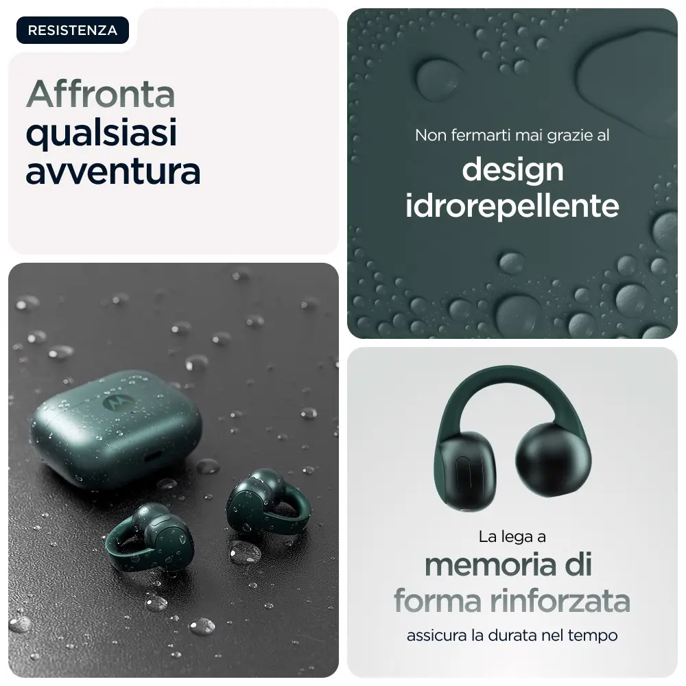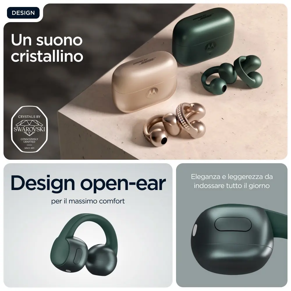 Ti presentiamo Moto Buds Loop, gli auricolari eleganti e leggeri progettati per migliorare la tua esperienza audio mantenendola connessa al mondo che ti circonda. Grazie al design open-ear, il modello Moto Buds Loop vanta il look che desideri, ma con il comfort per tutto il giorno di cui hai assolutamente bisogno. Mantieni il controllo della tua giornata frenetica senza perdere alcun dettaglio associando gli auricolari a dispositivi con tecnologia Moto AI.(1) Ascolta con suoni incredibilmente chiari e bilanciati grazie a Sound by Bose. Prova chiamate cristalline con il sistema di microfoni avanzato. E ottieni protezione costante grazie ai materiali premium e al design idrorepellente.(2) Con autonomia senza interruzioni fino a 8 ore(3) e ancora di più tramite la custodia, hai tutta la potenza che ti serve. Gli auricolari Moto Buds Loop sono sempre in sintonia con te.