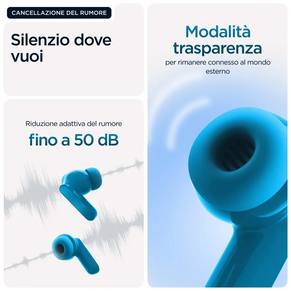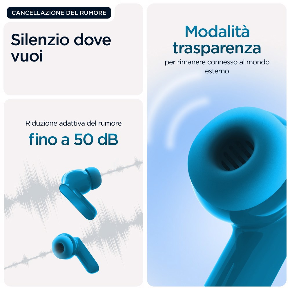 Che si tratti del drop nel tuo brano preferito o del ritmo che ti tiene in movimento, il basso è qualcosa che dovresti sentire. Motorola presenta i moto buds bass, con un ampio driver dinamico appositamente ottimizzato per bassi profondi e potenti e audio ad alta risoluzione.(1) Immergiti nella musica e nei film con un audio profondo e di impatto e bassi ricchi che animano ogni beat. Escludi il mondo attorno a te o mantieni la percezione dell'ambiente che ti circonda durante l'ascolto con l'eliminazione attiva e dinamica del rumore. Goditi chiamate vocali cristalline grazie al sistema con tre microfoni su ogni auricolare. Personalizza e controlla facilmente la tua esperienza di ascolto con l'app Moto Buds.(8) Oltre a tutto ciò, infinite ore di autonomia, ricarica rapida e design idrorepellente.(2) Senti il ritmo prendere vita con i moto buds bass.