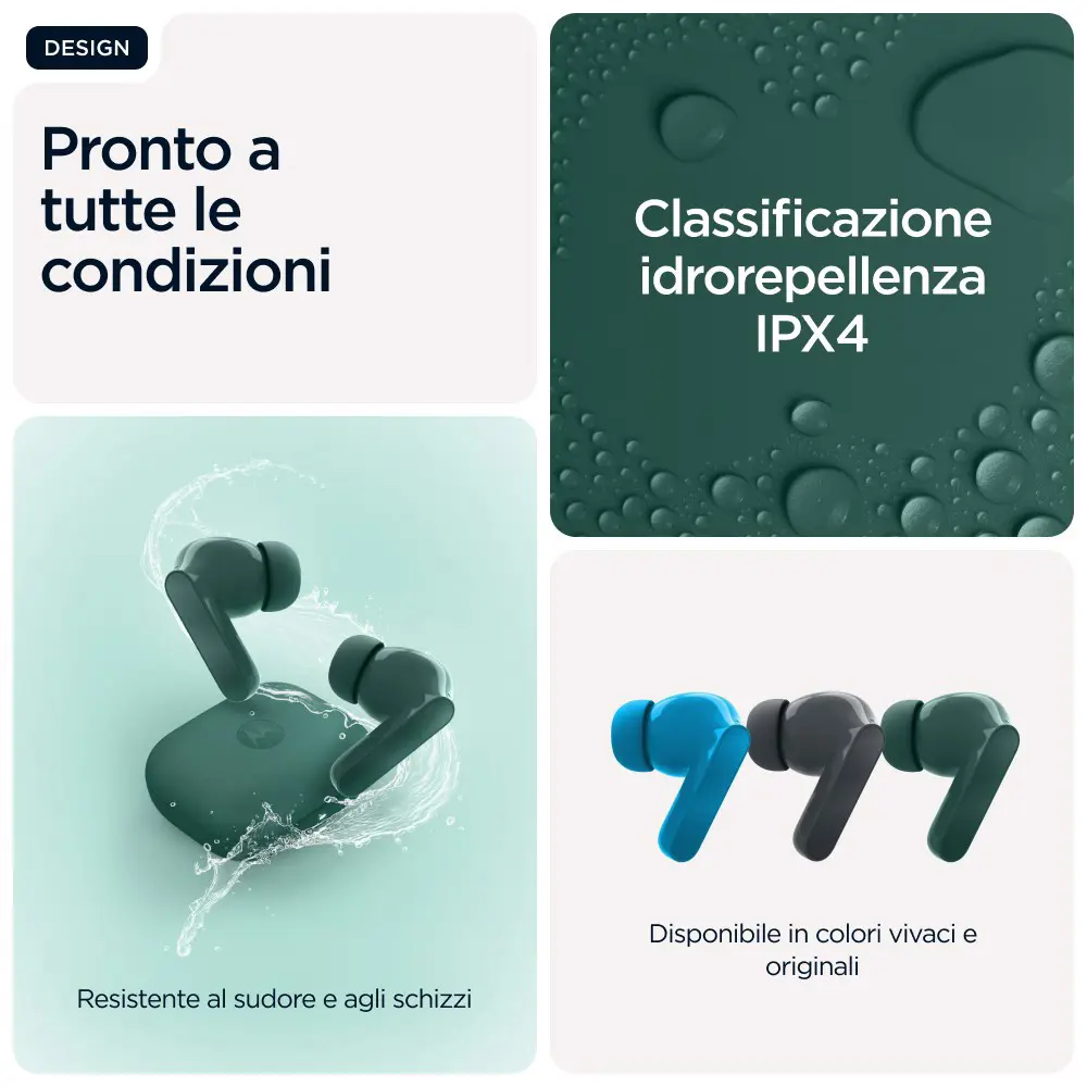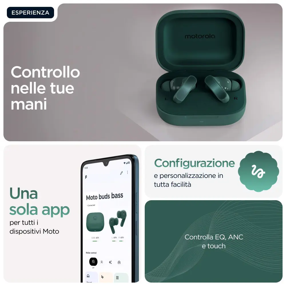 Che si tratti del drop nel tuo brano preferito o del ritmo che ti tiene in movimento, il basso è qualcosa che dovresti sentire. Motorola presenta i moto buds bass, con un ampio driver dinamico appositamente ottimizzato per bassi profondi e potenti e audio ad alta risoluzione.(1) Immergiti nella musica e nei film con un audio profondo e di impatto e bassi ricchi che animano ogni beat. Escludi il mondo attorno a te o mantieni la percezione dell'ambiente che ti circonda durante l'ascolto con l'eliminazione attiva e dinamica del rumore. Goditi chiamate vocali cristalline grazie al sistema con tre microfoni su ogni auricolare. Personalizza e controlla facilmente la tua esperienza di ascolto con l'app Moto Buds.(8) Oltre a tutto ciò, infinite ore di autonomia, ricarica rapida e design idrorepellente.(2) Senti il ritmo prendere vita con i moto buds bass.