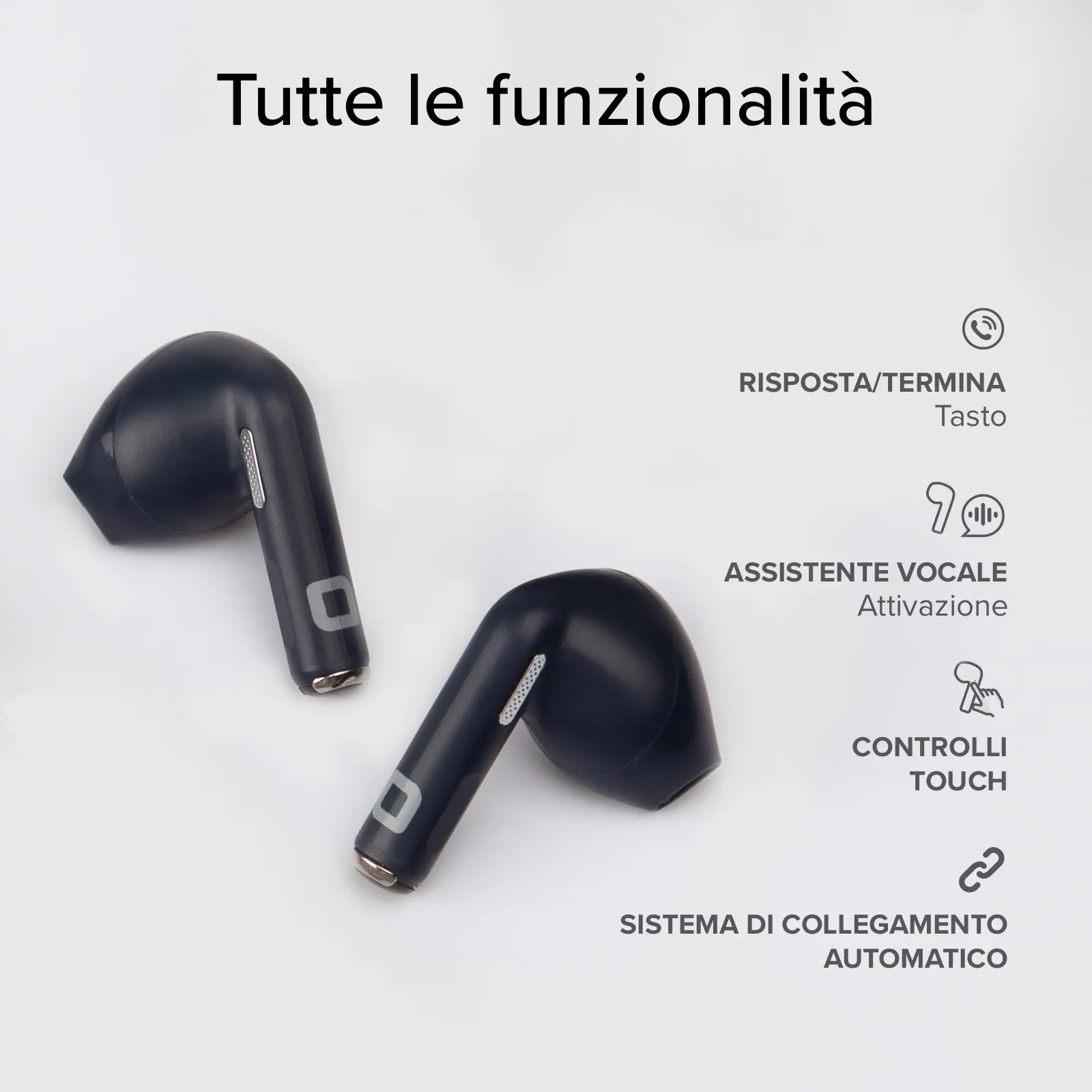 I controlli touch posti sugli auricolari ti assicurano il massimo controllo su muisca e chiamate con un semplice tocco, senza mai toccare il device connesso. Potrai riprodurre/mettere in pausa la musica, cambiare traccia, rispondere/finire/rifiutare una chiamata, richiamare l'ultimo numero e anche attivare l'assistente vocale Google o iOs.