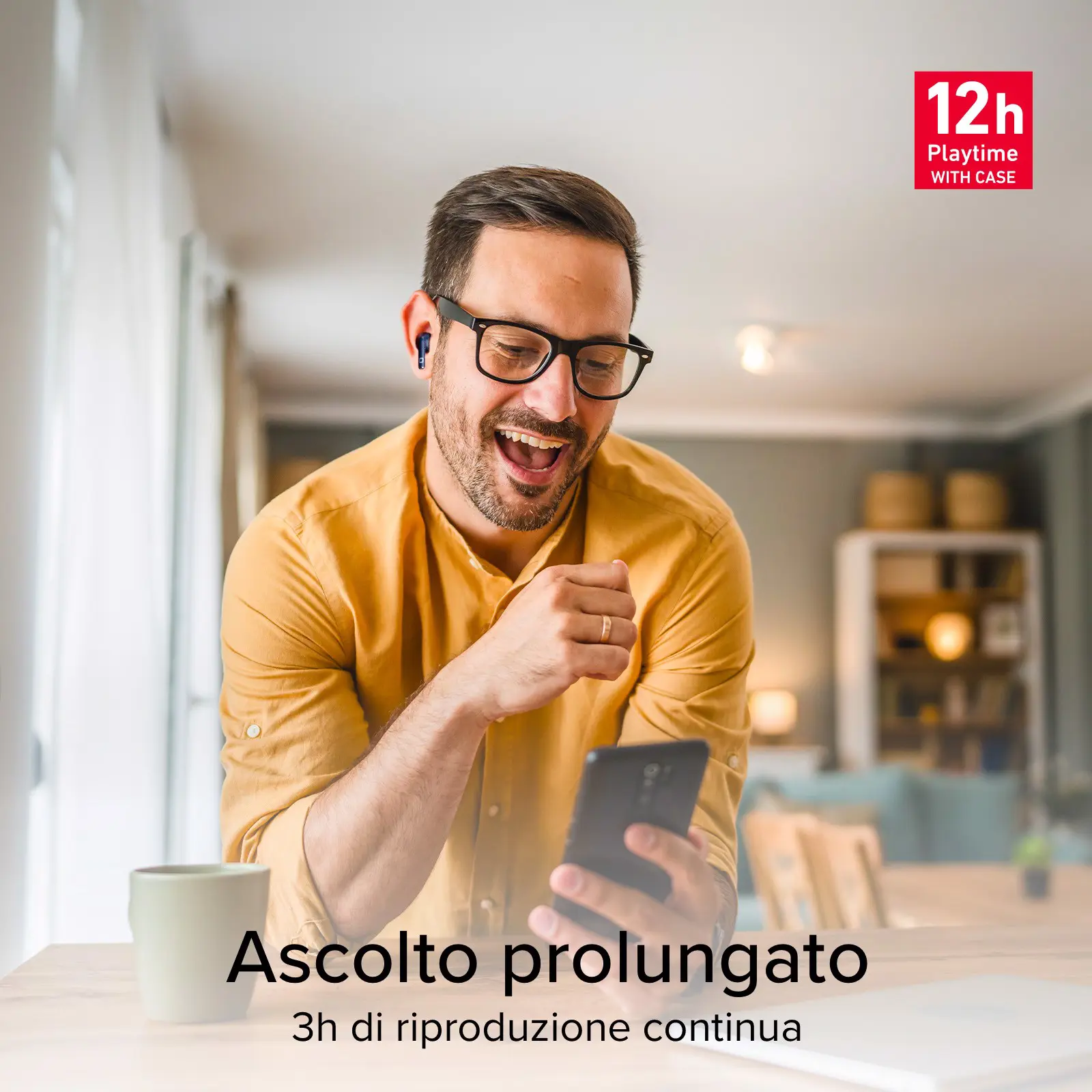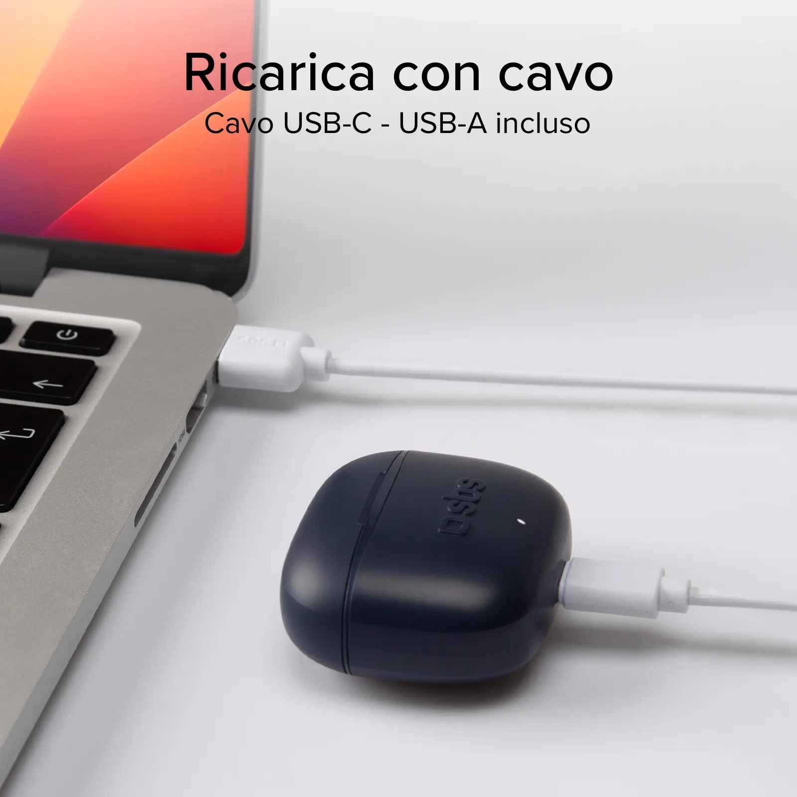 La custodia da 200 mAh non solo protegge gli auricolari, ma ti dà la possibilità di ricaricarli senza un'ulteriore fonte di energia. Riponi gli auricolari al suo interno e la ricarica partirà in automatico. Grazie alla basetta, otterrai fino a 12 ore di riproduzione. Quando anch'essa termina l'energia, potrai collegarla ad un caricatore o power bank usando il cavo USB-A - USB-C incluso.