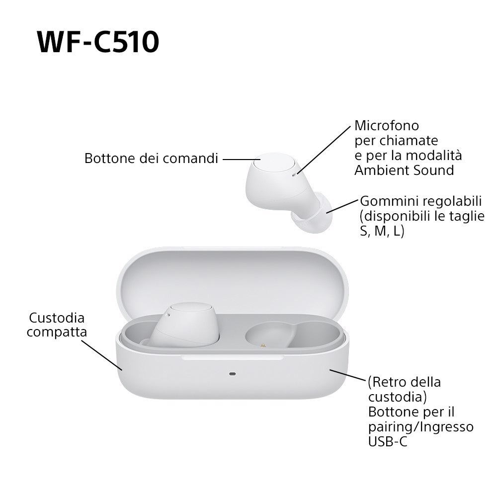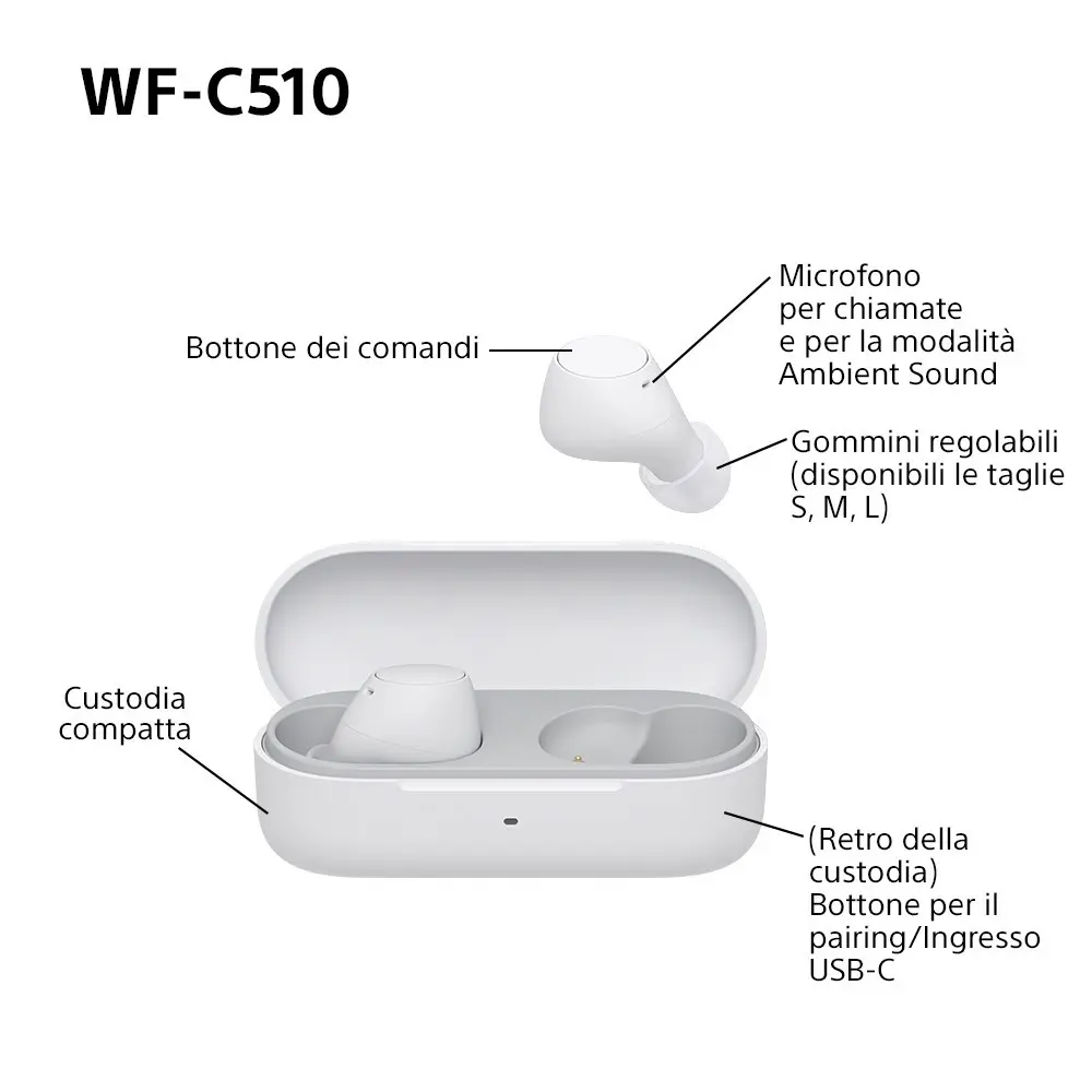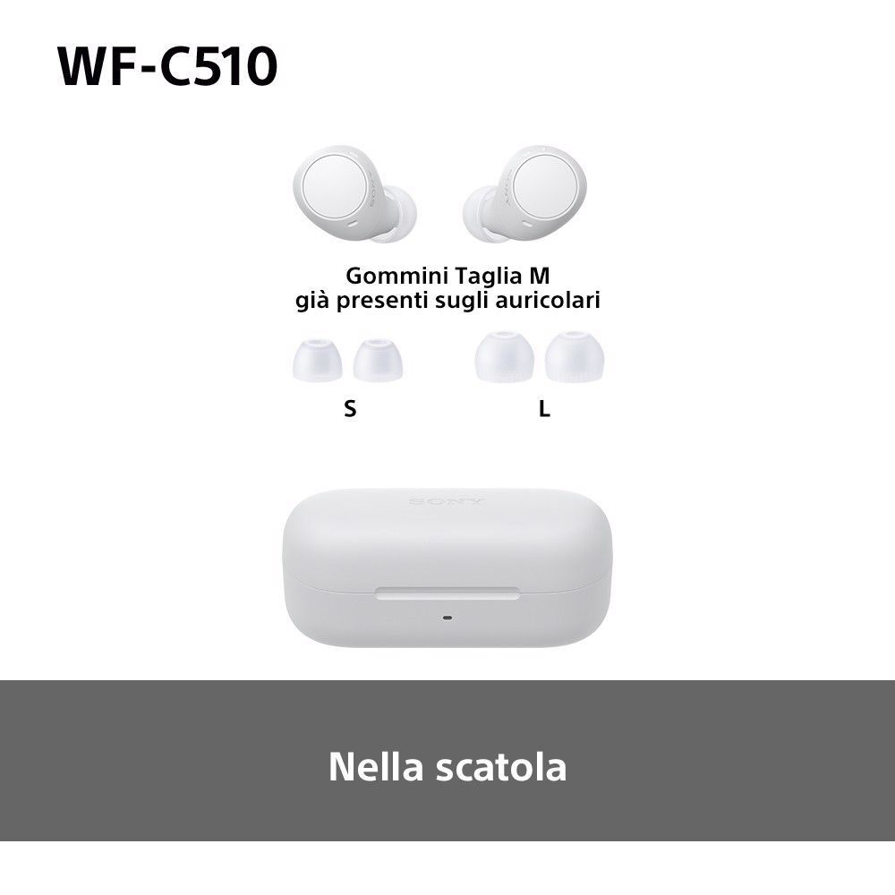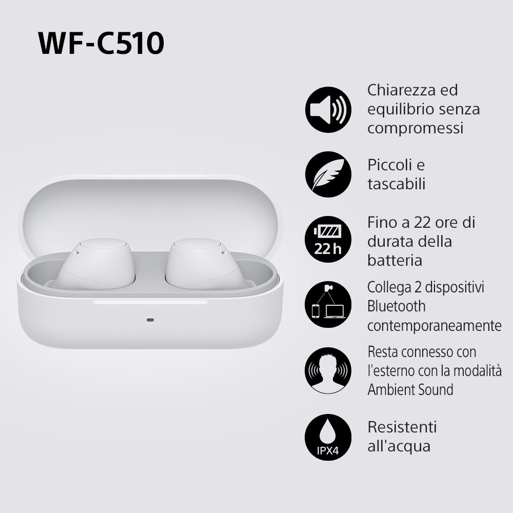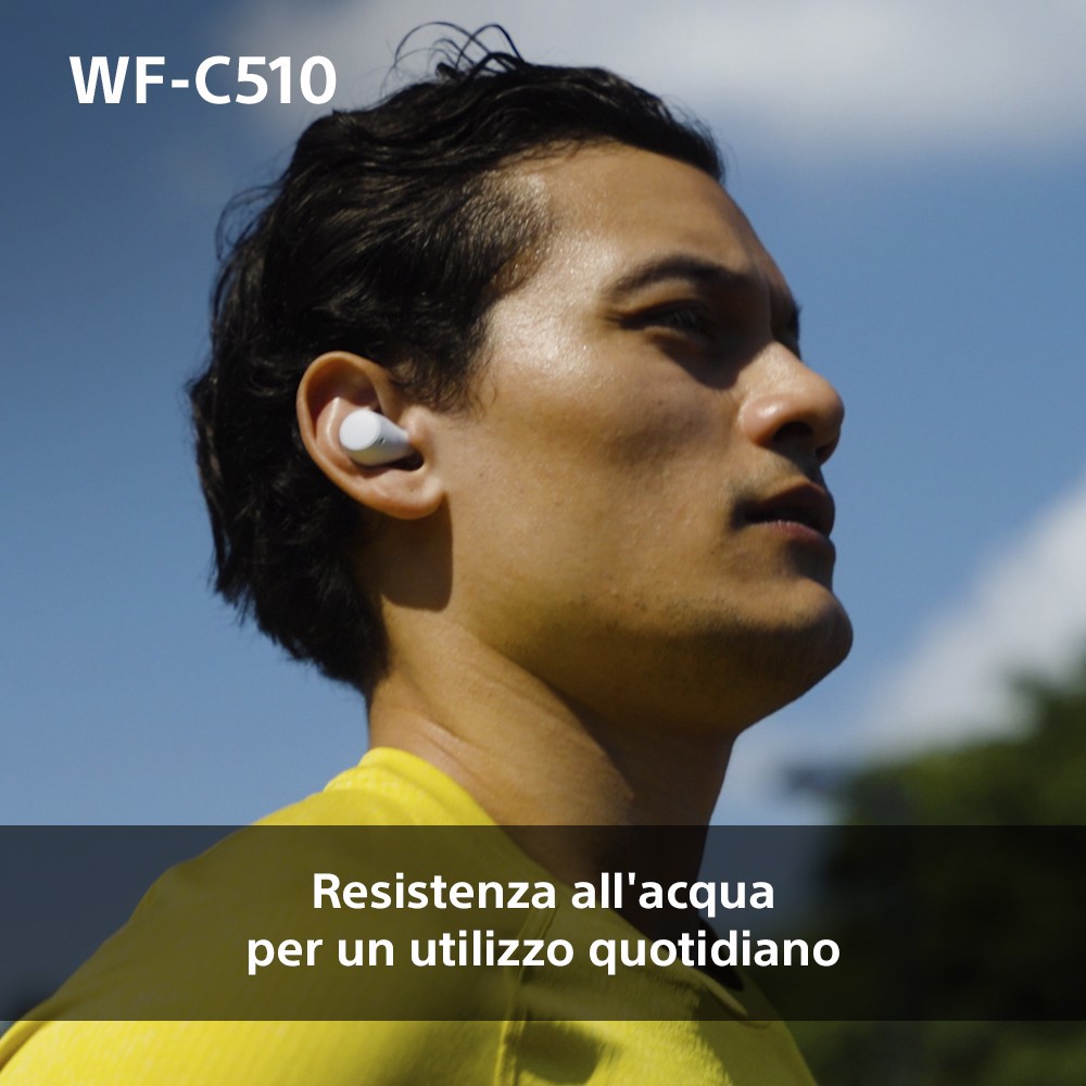 Ti presentiamo gli auricolari Sony WF-C510: incredibilmente comodi, con una fantastica qualità del suono e ricchi di funzionalità, questi sono tra i nostri auricolari più piccoli e leggeri di sempre! Con ogni auricolare che pesa solo 4,6 g, in un design ergonomico che garantisce comfort e stabilità, questi auricolari Bluetooth possono essere indossati per lungo tempo in perfetto comfort. Suonano anche in modo fantastico. Con la tecnologia DSEE di Sony per eseguire l'upscaling della musica compressa più vicino alla sua qualità originale e un equalizzatore facile da usare che ti consente di modificare l'audio secondo le tue preferenze personali, ad esempio, aumentando i bassi per un suono più ricco e profondo o aumentando gli alti per una maggiore chiarezza e dettaglio. In alternativa, puoi scegliere tra uno dei preset audio per trovare il suono migliore per te. Questi auricolari Bluetooth Sony sono dotati della modalità Ambient Sound, così puoi rimanere consapevole di ciò che ti circonda senza dover interrompere la musica o rimuovere gli auricolari. Perfetto per stare al sicuro quando vai a fare jogging, ascoltare gli annunci e altro ancora. Con 22 ore di riproduzione (11 ore dagli auricolari, più 11 ore extra dalla custodia) puoi continuare ad ascoltare il WF-C510 tutto il giorno. E con una funzione di ricarica rapida che ti offre 1 ora di riproduzione con una ricarica di soli 5 minuti, non rimarrai senza la tua musica a lungo. Gli auricolari wireless sono classificati IPX4, il che significa che sono resistenti all'acqua. Quindi, non c'è bisogno di preoccuparsi del sudore dell'allenamento o di essere sorpresi dalla pioggia. Incredibilmente leggeri, estremamente confortevoli e disponibili in quattro diversi colori, puoi goderti la tua musica con stile con i WF-C510.