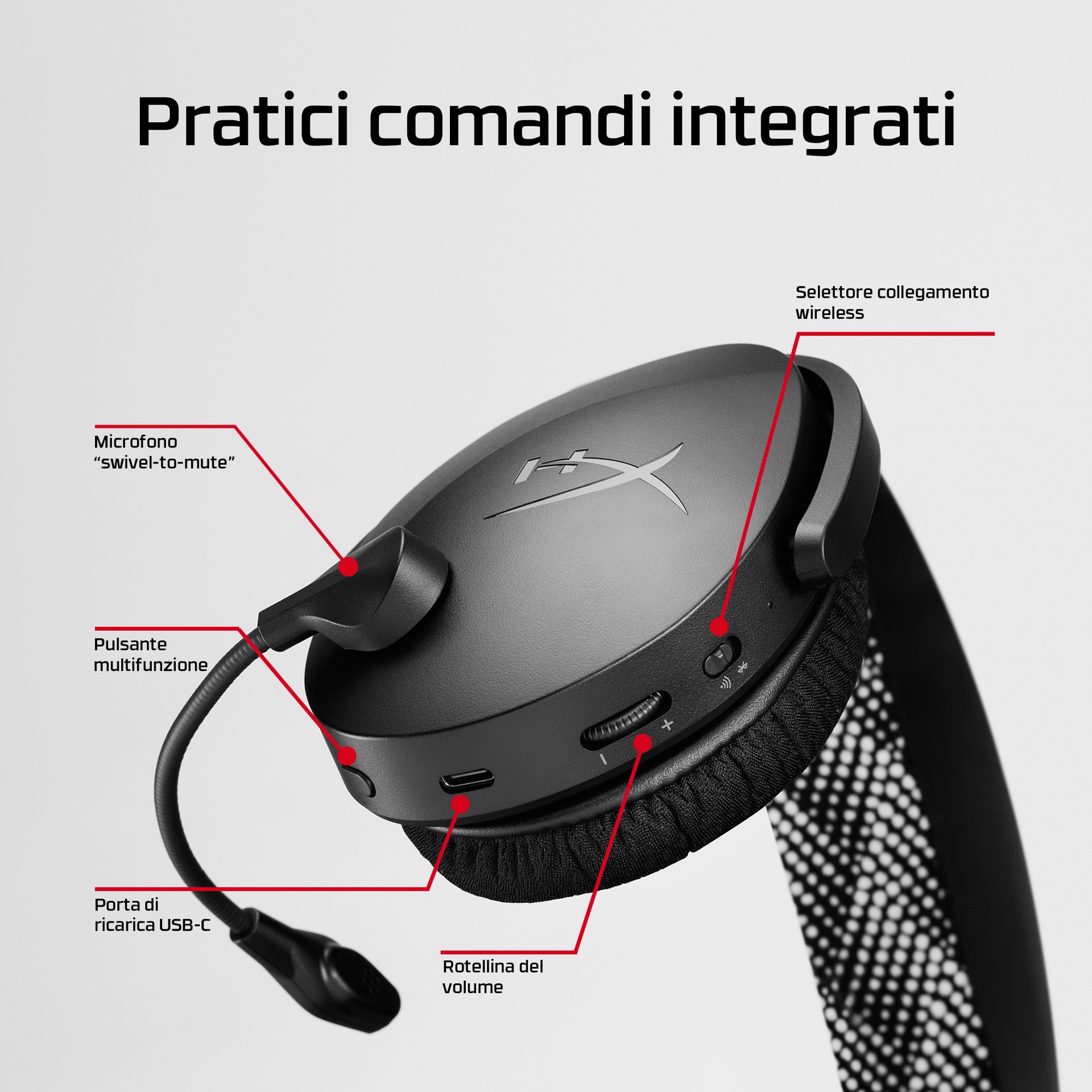 Le cuffie wireless HyperX Cloud Jet Dual offrono un'esperienza eccezionale con la connettività a 2,4 GHz e Bluetooth 5.3. Sono ideali per i nuovi appassionati del gaming o per chi desidera passare da un dispositivo entry-level a un modello superiore. Muoviti facilmente tra PC, console e dispositivo mobile, con un’esperienza audio straordinaria offerta dai driver da 40 mm. Comunica in modo cristallino con il tuo team grazie al microfono ad archetto swivel-to-mute. Con una autonomia fino a 25 ore[1], puoi immergerti in sessioni di gioco prolungate senza interruzioni. I controlli integrati semplificano la regolazione del volume, l'esclusione del microfono e il passaggio da una connessione all'altra. Inoltre, il design leggero, i padiglioni in mesh traspirante e l'archetto elastico di sospensione offrono il massimo comfort per le lunghe maratone di gioco. Alza il livello della tua gaming experience con HyperX Cloud Jet!