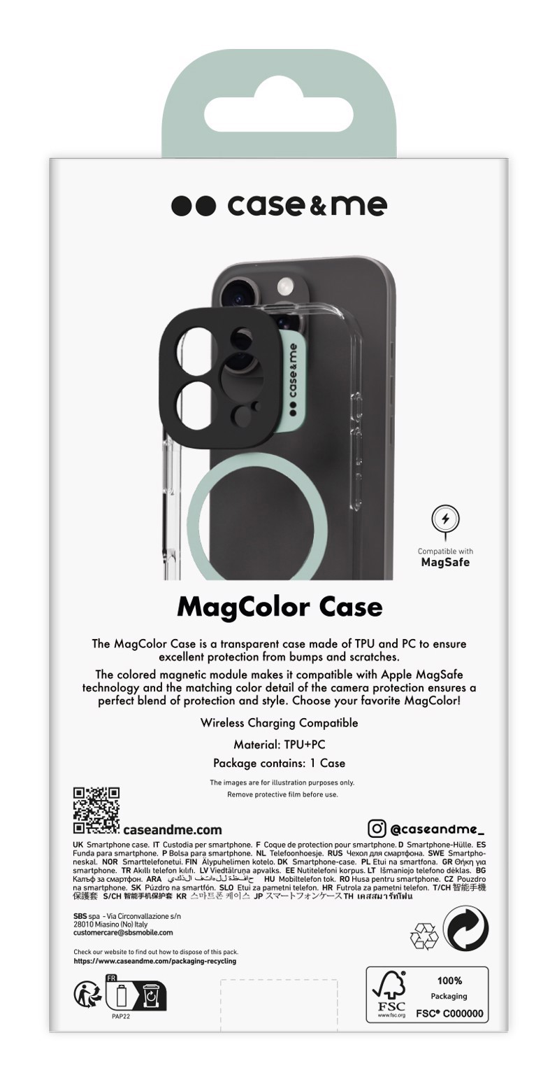 Il modulo per MagSafe e la linguetta "case&me" sono colorate: cerca la cover che si abbina al tuo iPhone e ai tuoi outfit per creare