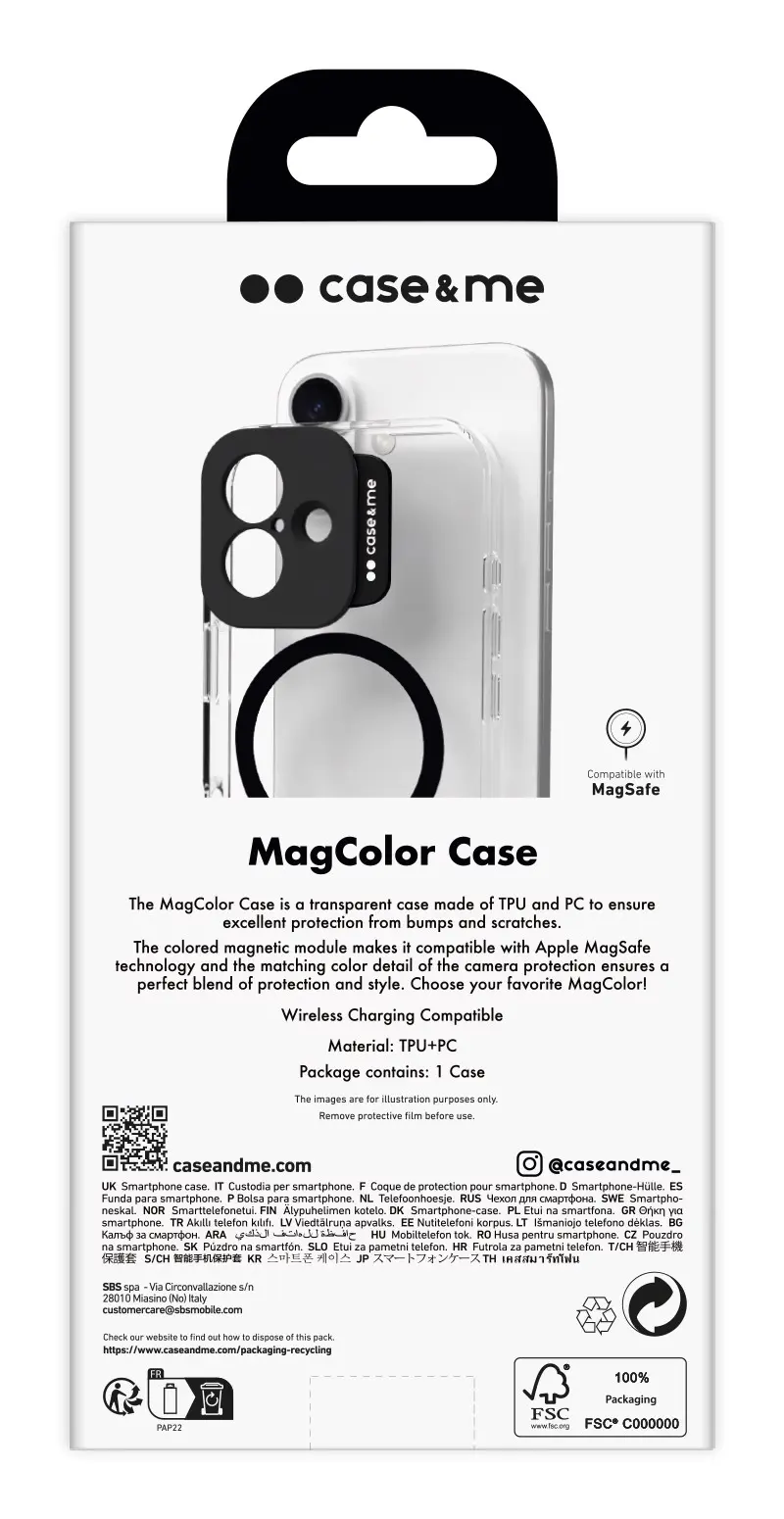 Il modulo per MagSafe e la linguetta "case&me" sono colorate: cerca la cover che si abbina al tuo iPhone e ai tuoi outfit per creare