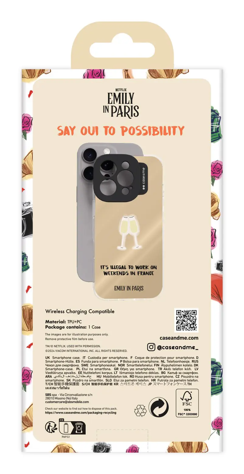 Personalizza il tuo iPhone 16 Pro con una cover caratterizzata da scritte e immagini della serie TV Emily in Paris. Riporta la famosa frase della serie "it's illegal to work on weekends in France" con due bicchieri che brindano. Porta sempre con te un pizzico di leggerezza e voglia di festeggiare.