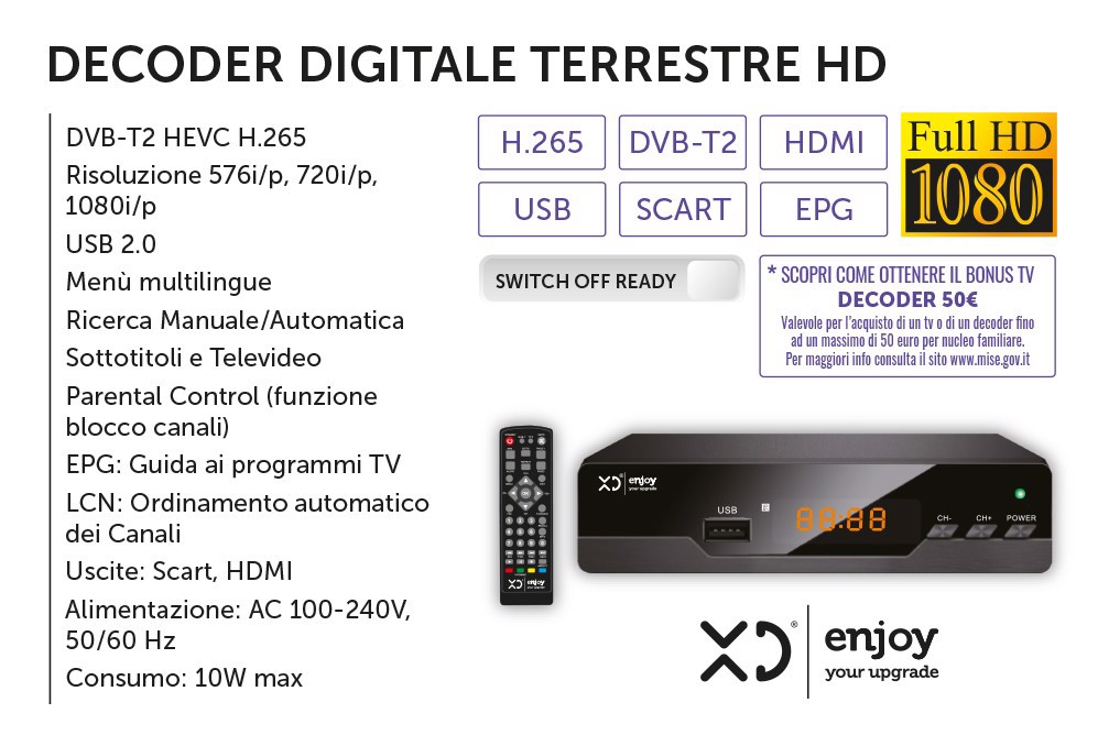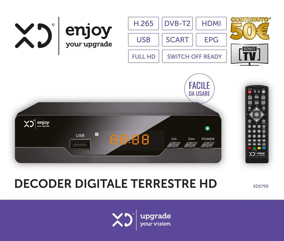 XD Enjoy XDS799, Terrestre, Full HD, DVB-T2, 720 x 576,1280 x 720,1920 x 1080, 576i, 576p, 720i, 720p, 1080i, 1080p, H.265, HEVC