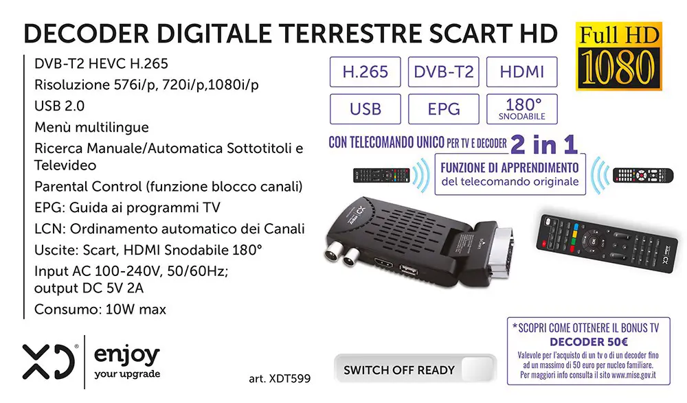 XD Enjoy XDT599, Terrestre, Full HD, DVB-T2, 720 x 576,1280 x 720,1920 x 1080, 576i, 576p, 720i, 720p, 1080i, 1080p, H.265, HEVC