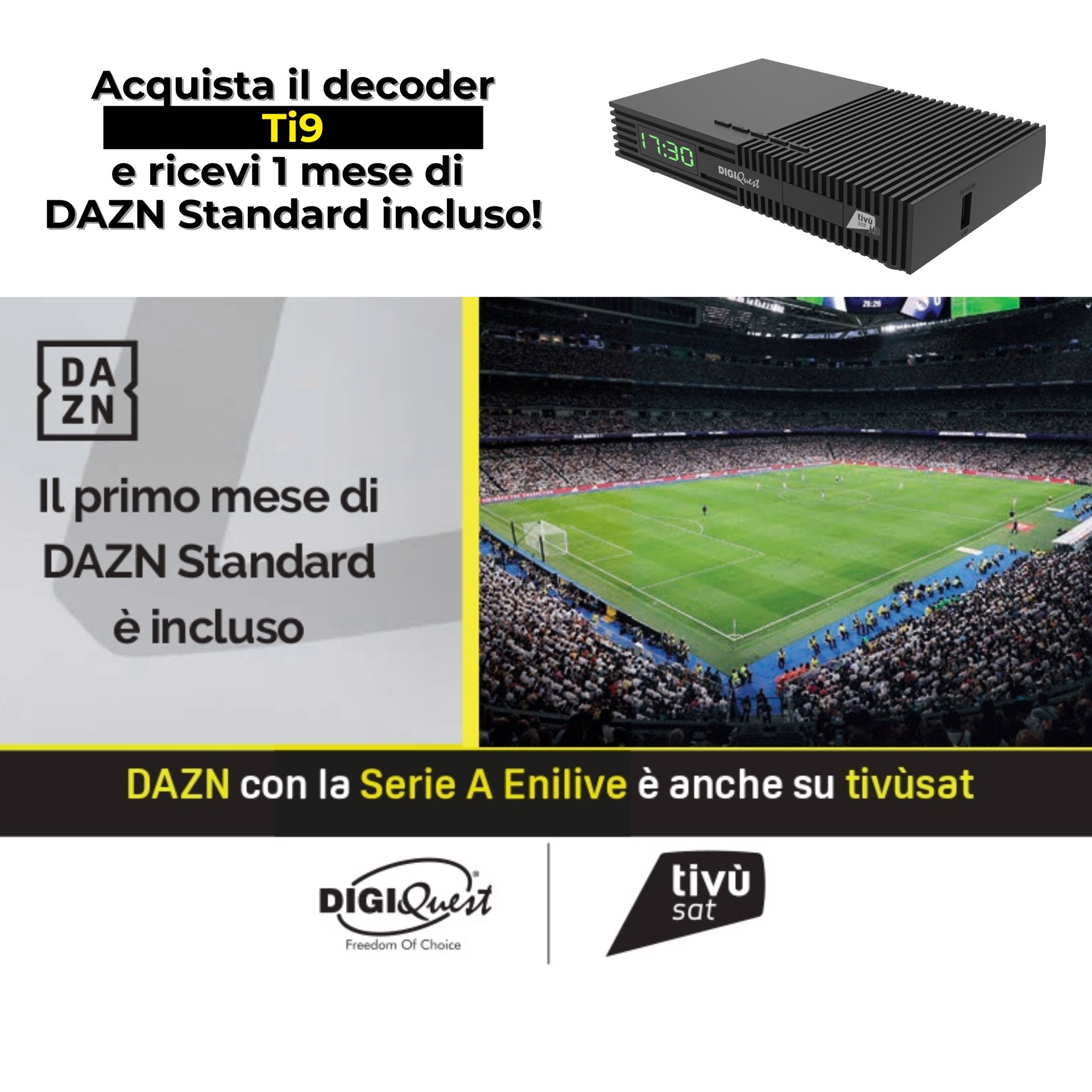 ACQUISTA DIGIQUEST, VIVI IL GRANDE SPORT! Per te 1 mese di DAZN Standard INCLUSO. Approfitta adesso della promozione per vedere tutte le partite di Serie A Enilive, LaLiga EA Sports, basket, tennis, NFL, boxe, MMA, ciclismo e tanti altri contenuti esclusivi. In più, fino al 19 agosto 2024, potrai ricevere 2 mesi senza costi aggiuntivi per la visione di DAZN 1 e DAZN 2 sulla piattaforma tivùsat. Per la visione dei programmi televisivi gratuiti e codificati della piattaforma tivùsat e di tutti i canali satellitari FreeToAir (HotBird, Astra, ecc.). Soluzione ideale per chi ha problemi di segnale digitale terrestre e per chi vuole godere dell'altissima qualità satellitare. Il Ti9 è anche un Mediaplayer ed è corredato di un telecomando 2in1 che permette di poter controllare anche le principali funzioni della TV. Facile da usare, grazie al rilevamento automatico dell'impianto satellitare, alla sintonizzazione rapida dei canali del pacchetto tivùsat e alla possibilità di attivare la funzione di registrazione. Alimentatore 12V che ne permette l'utilizzo anche in movimento (camper, barche). Tessera tivùsat inclusa nella confezione da attivare sul sito www.tivusat.tv - Ricevitore digitale satellitare DVB-S2 HEVC Main 10 (10bit) - Risoluzione video fino a 1080p (Full HD) - Display alfanumerico con visualizzazione orario in standby - 1 Lettore Smart Card Nagravision compatibile con la piattaforma tivùsat - Funzione fast boot (riavvio veloce). Velocizza l'accensione del decoder rendendo più rapida la visione - Funzione back-up e ripristino configurazioni della prima installazione - Funzione ricerca rapida, permette di sintonizzare solo i canali appartenenti al pacchetto tivùsat, velocizzando la ricerca - Funzione Mediaplayer via USB2: riproduzione di video (MKV, AVI, MP4, DiVX),audio (MP3), immagini (JPG, BMP) - HDR (high dynamic range) compatibile - Network APP - Visualizzazione delle APP presenti nel decoder - Supporta connessione WIFI tramite DONGLE USB specifico (non incluso) - Canali TV e radio memorizzabili - Installazione rapida e menu di facile utilizzo - Menu multilingua (italiano, inglese e tedesco) - EPG - Guida elettronica ai programmi TV - Ordinamento canali automatico EASY HD tivùsat - Aggiornamento automatico dei canali tivùsat - Ricerca canali automatica e manuale - Aggiornamento automatico dei canali in standby - Audio Dolby Digital / Dolby digital plus - Varie funzioni canali: Lista favoriti, Parental control, ecc. - Rilevamento automatico dell'impianto satellitare - Possibilità di salvare la propria lista canali su USB e ricaricarla se necessario - Timer e Televideo - Sottotitoli e doppio audio (se disponibili) - Formato video 16:9, 4:3, Auto - Accensione su l'ultimo canale visualizzato - Autostandby: spegnimento automatico dopo 3 ore di inattività - DiSEqC 1.0, 1.1, 1.2, USALS, SCR, dCSS unicable - Aggiornamento software tramite OTA/USB/FTP - Alimentazione 12V 1,5A - Supporta HUB USB ** Da HDD esterno o Pen Drive. Non tutti gli HDD e HUB USB (se supportato) sono compatibili, si consigliano HDD alimentati esternamente. **** Per poter accedere alle APP e all'aggiornamento FTP è necessaria la connessione ad una rete tramite porta LAN o dongle WiFi USB specifico (non incluso). ACCESSORI INCLUSI - Telecomando 2 in 1 - Smartcard tivùsat - Alimentatore esterno: Input 100-240V~50/60Hz Output 12V 1,5A