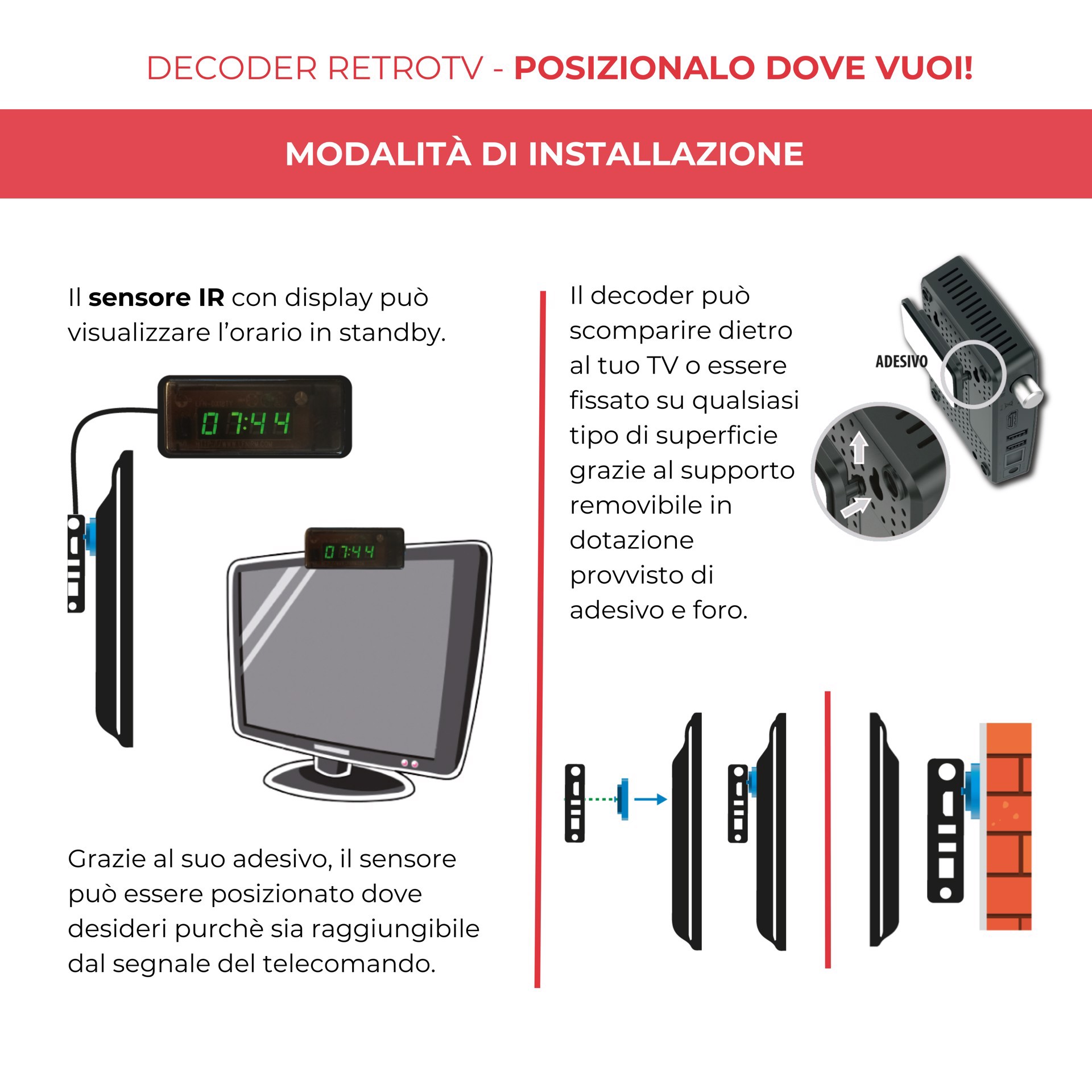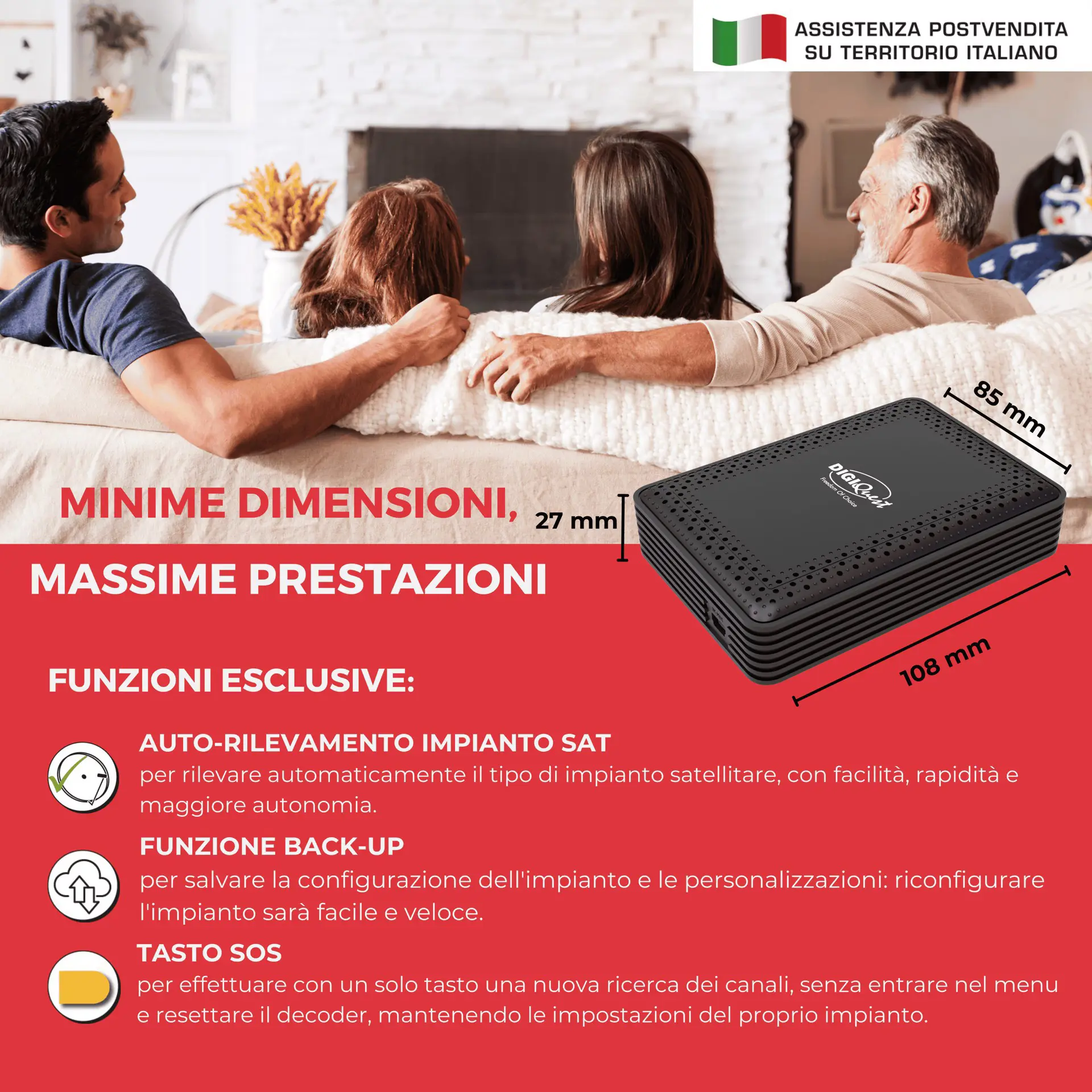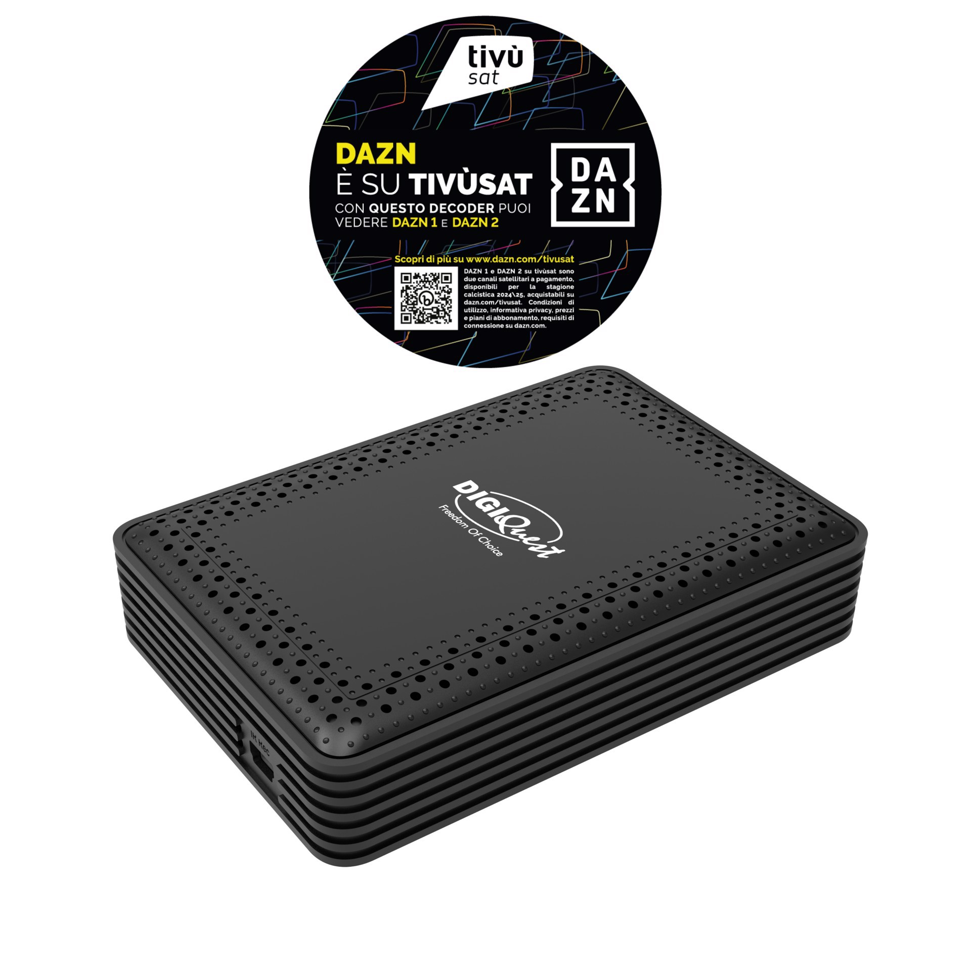 Minime dimensioni, massime prestazioni. L’unico decoder tivùsat retro TV: può scomparire dietro al tuo TV o essere fissato su qualsiasi tipo di superficie grazie al supporto removibile in dotazione provvisto di adesivo e foro. Sensore IR con display che, se si desidera, può visualizzare l’orario in standby. Facile da usare, grazie all'auto-rilevamento dell'impianto satellitare, alla funzione back-up e al tasto SOS. Per la visione dei programmi televisivi gratuiti e codificati della piattaforma tivùsat e di tutti i canali satellitari FreeToAir (HotBird, Astra, ecc.), soluzione ideale per chi ha problemi di segnale digitale terrestre e per chi vuole godere dell'altissima qualità satellitare. Mediaplayer e telecomando 2in1 che permette di poter controllare anche le principali funzioni della TV. Alimentatore 12V che ne consente l'utilizzo anche in movimento (camper, barche). SIMcard tivùsat inclusa nella confezione. Funzione di registrazione attivabile.