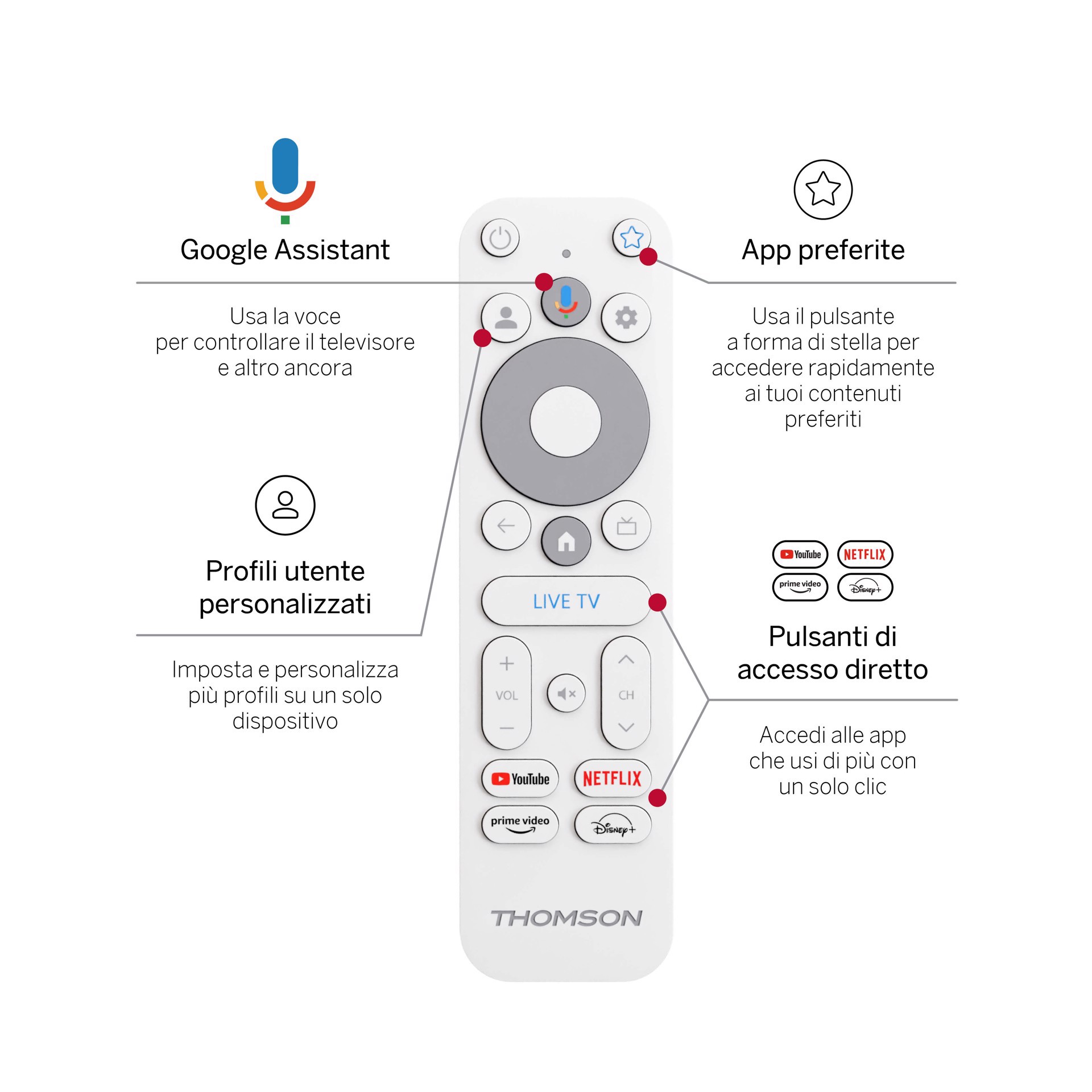 L'intrattenimento personalizzato è a portata di clic: configura più profili utente per ottenere consigli su misura per tutti i membri della famiglia. E con Google Cast integrato, puoi duplicare o trasmettere contenuti dal tuo smartphone direttamente sullo schermo della TV, senza alcuno sforzo.