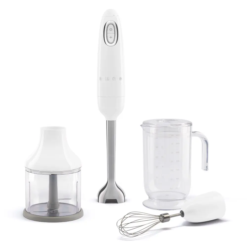 Smeg HBF03WHEU. Velocità (minima) di rotazione: 8150 Giri/min, Velocità (massima) di rotazione: 14850 Giri/min, Tipo di controllo: Pulsanti. Tipo: Frullatore ad immersione, Colore del prodotto: Acciaio inox, Bianco, Lunghezza cavo: 1,5 m. Bicchiere: 1,4 L. Materiale della scocca: Plastica, Materiale manico: Plastica, Materiale lama: Acciaio inox. Potenza: 700 W, Alimentazione: AC, Tensione di ingresso AC: 220 - 240 V