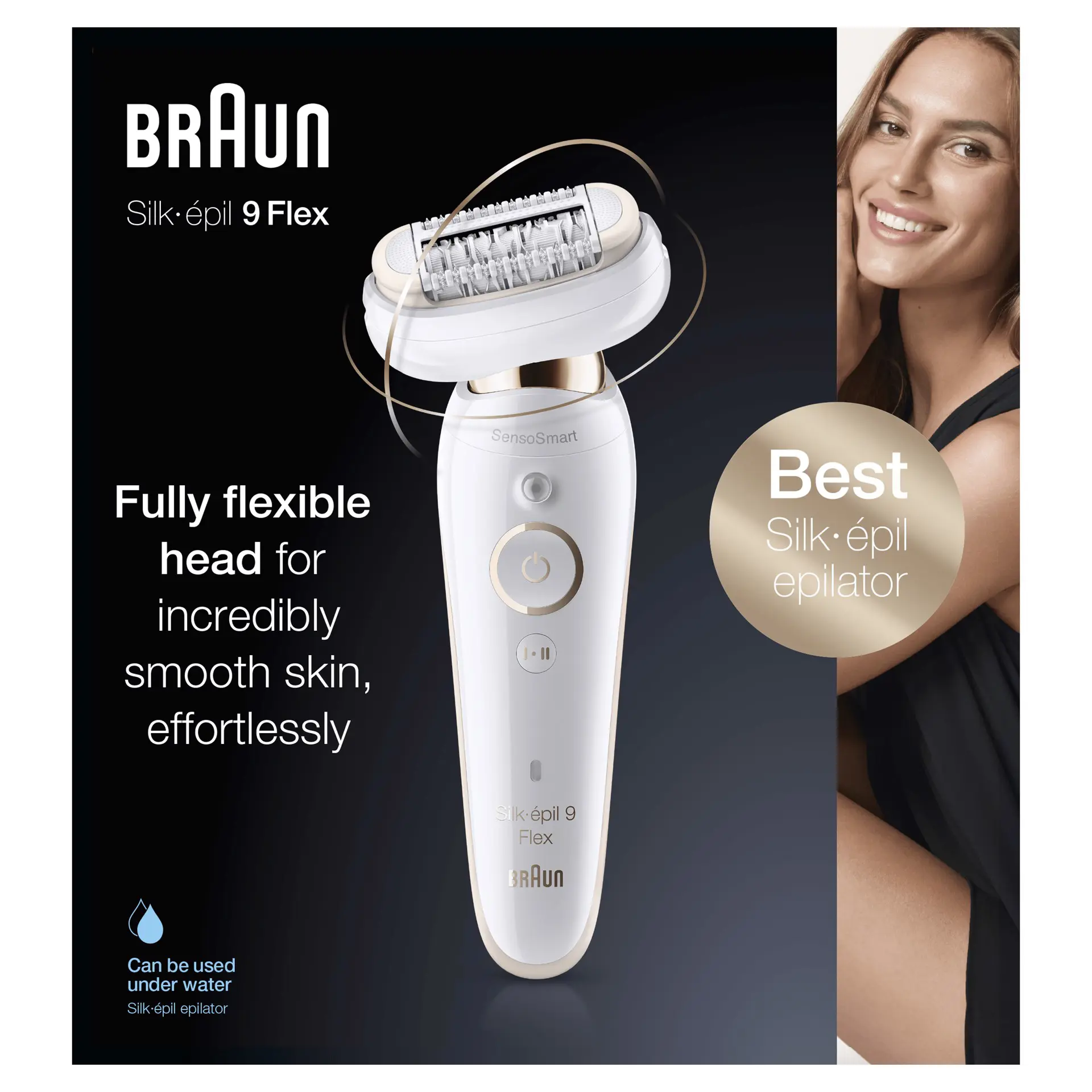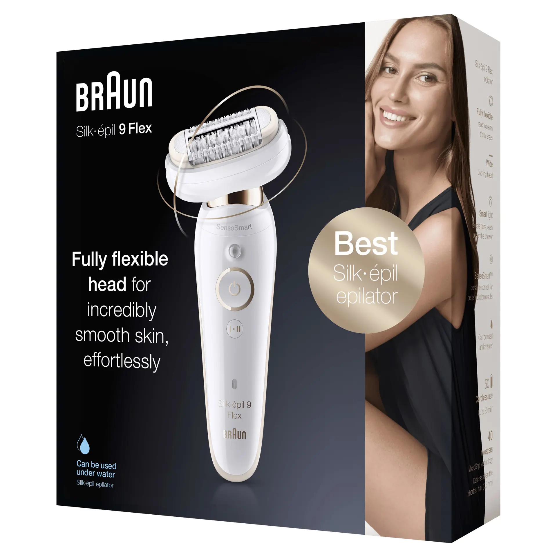 Braun Silk-épil 9 Flex 9-001, Epilatore Donna Testina Flessibile Per Epilazione Semplice. Colore del prodotto: Bianco, Oro, Numero di pinzette: 40 pinzette, Aree del corpo: Ascella, Bikini, Avancoscia, Ascelle. Alimentazione: Batteria, Tensione di ingresso AC: 100 - 240 V, Tipo batteria: Batteria integrata. Peso: 478 g, Peso della batteria: 31,9 g. Tipo di imballo: Scatola, Larghezza imballo: 65 mm, Profondità imballo: 180 mm. Quantità per pacco: 1 pz, Larghezza scatola principale: 188 mm, Lunghezza del cartone principale: 406 mm