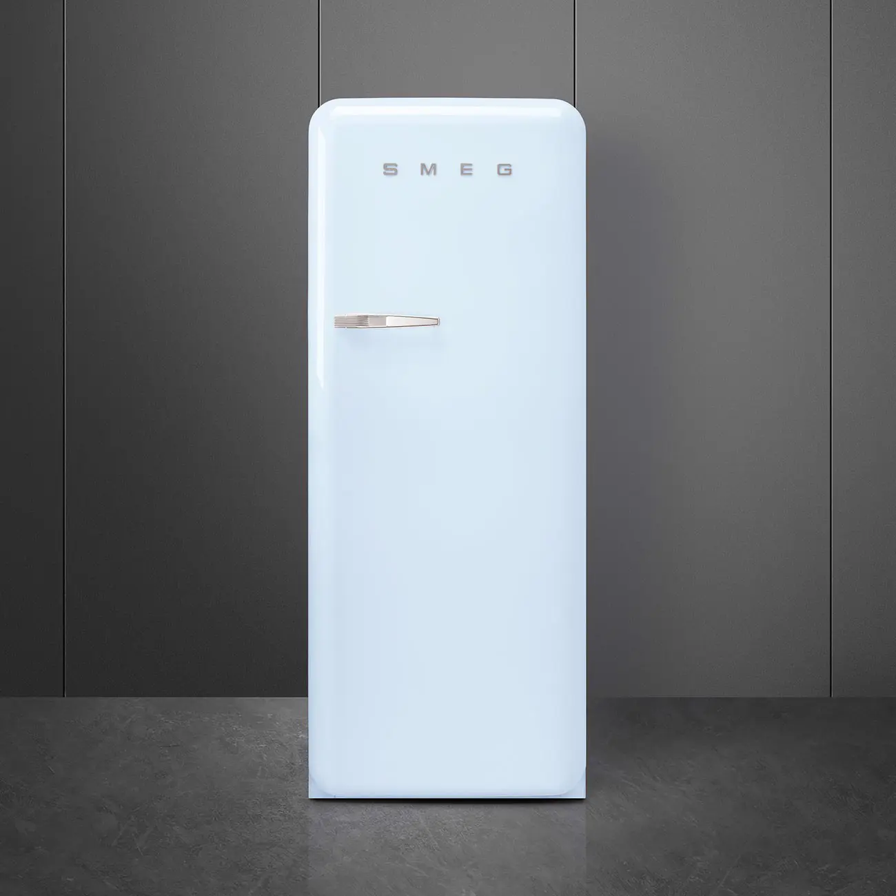Smeg FAB28RPB5. Posizionamento dell'apparecchio: Libera installazione, Colore del prodotto: Blu, Cerniera porta: Destra. Capacità netta totale: 270 L, Classe climatica: SN-T, Classe emissione rumore: B. Capacità netta frigorifero: 244 L, Tipo di lampada: LED, Capacità netta del compartimento zona fresca: 244 L. Posizione del congelatore: Posto in alto, Capacità netta congelatore: 26 L, Capacità di congelamento: 2 kg/24h. Lunghezza cavo: 1,8 m