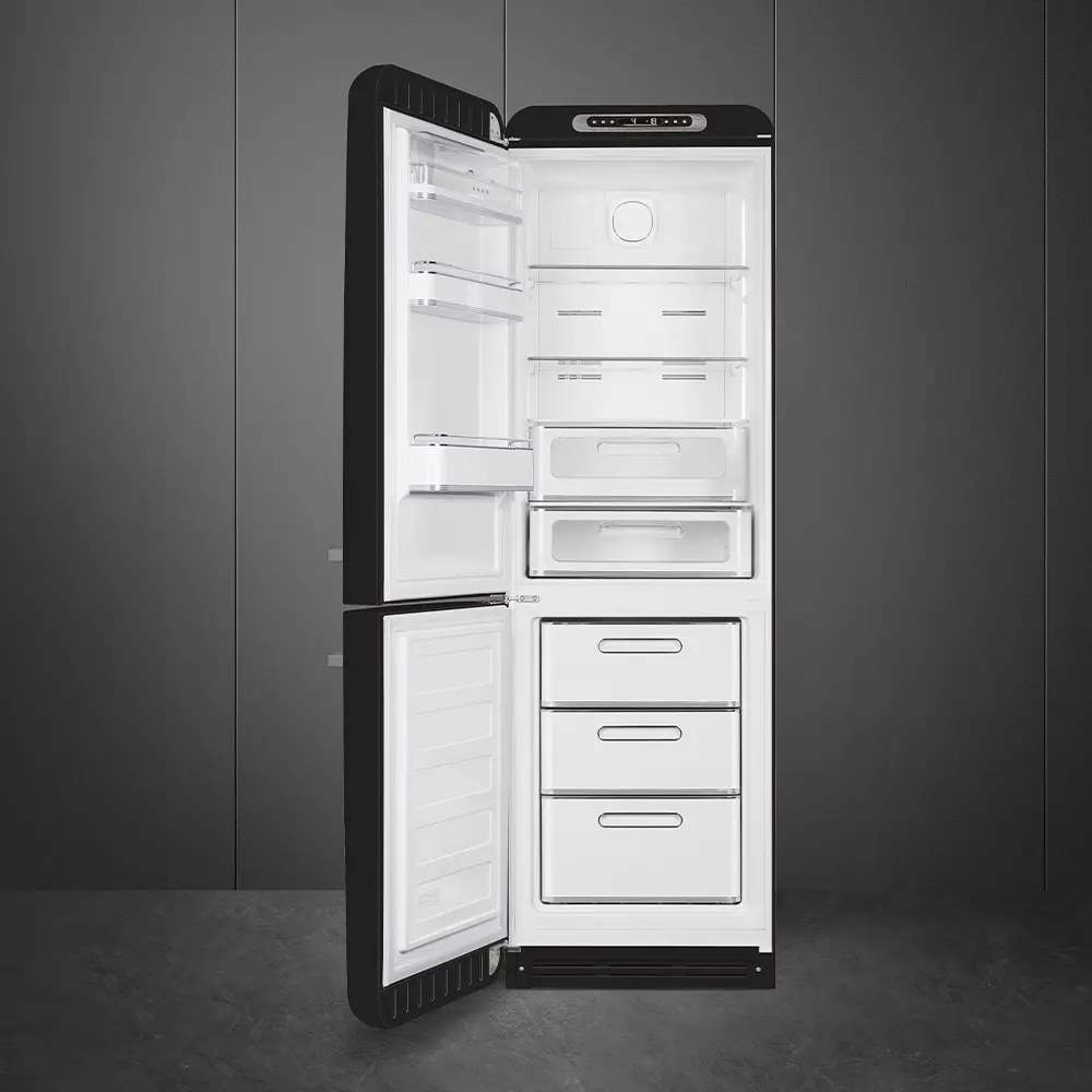 Smeg FAB32LBL5. Capacità netta totale: 331 L. Cerniera porta: Sinistra, Tipo di display: LCD. Classe climatica: ST-T, Emissione acustica: 37 dB. Capacità netta frigorifero: 204 L, No Frost (frigorifero), Sistema Multi-Airflow (frigorifero), Luce interna. Capacità netta congelatore: 97 L, Capacità di congelamento: 6 kg/24h, No Frost (congelatore). Classe efficienza energetica: D, Consumo energetico annuo: 178 kWh. Colore del prodotto: Nero