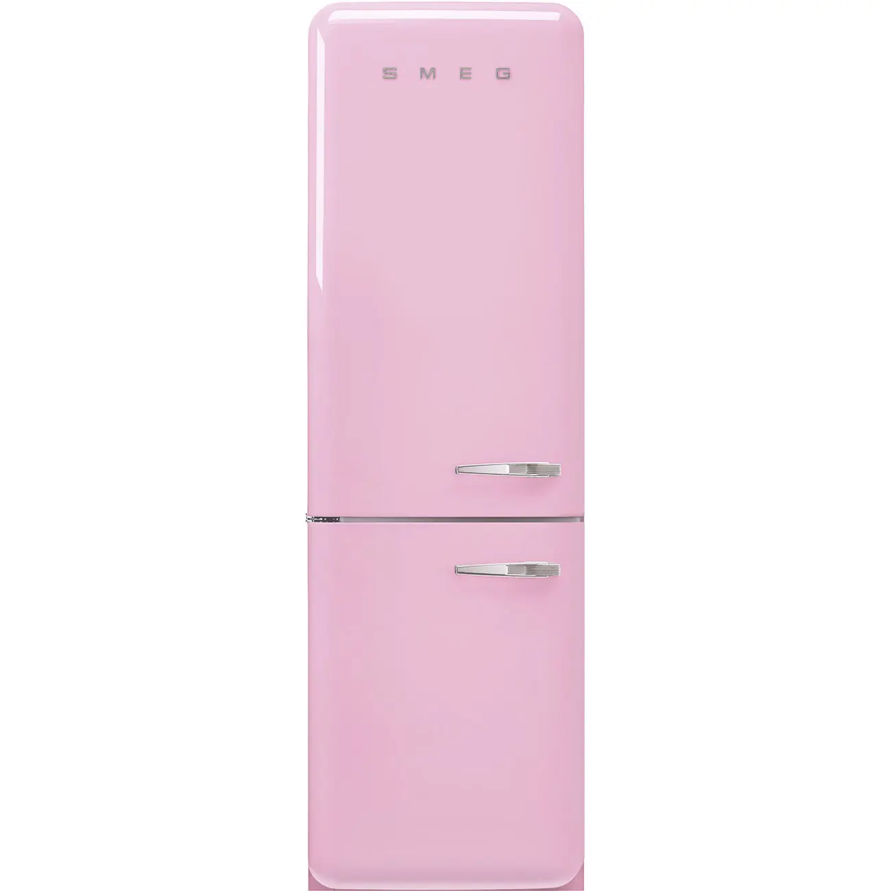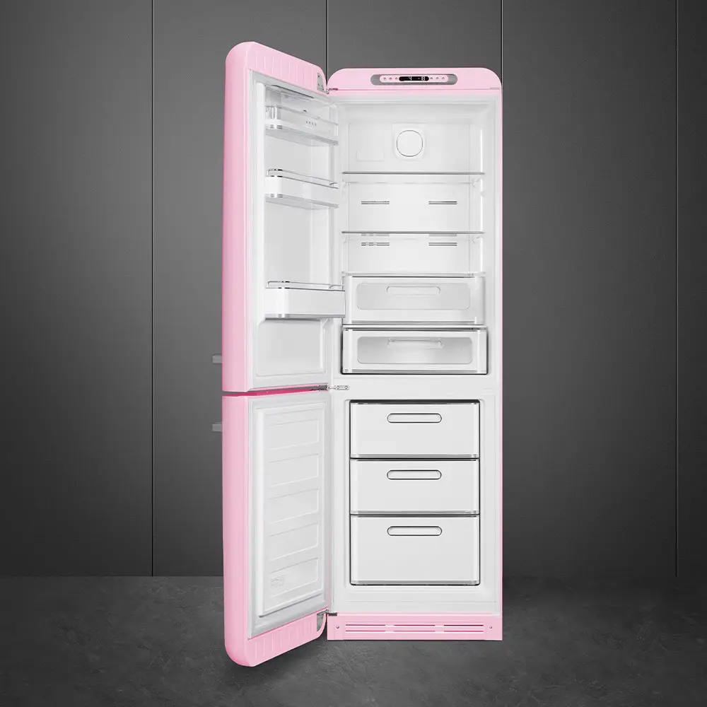 Smeg FAB32LPK5. Capacità netta totale: 331 L. Cerniera porta: Sinistra, Tipo di display: LED. Classe climatica: ST-T, Emissione acustica: 37 dB. Capacità netta frigorifero: 204 L, No Frost (frigorifero), Sistema Multi-Airflow (frigorifero), Luce interna. Capacità netta congelatore: 97 L, Capacità di congelamento: 6 kg/24h, No Frost (congelatore). Classe efficienza energetica: D, Consumo energetico annuo: 178 kWh. Colore del prodotto: Rosa
