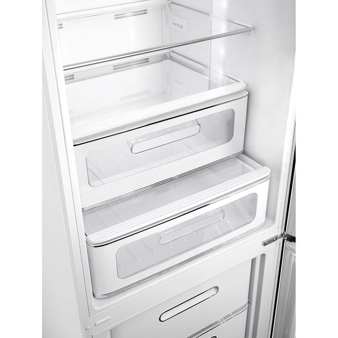 Smeg FAB32RWH5. Capacità netta totale: 331 L. Cerniera porta: Destra, Tipo di display: LED. Classe climatica: SN-T, Emissione acustica: 37 dB. Capacità netta frigorifero: 234 L, No Frost (frigorifero), Sistema Multi-Airflow (frigorifero), Luce interna. Capacità netta congelatore: 97 L, Capacità di congelamento: 6 kg/24h, No Frost (congelatore). Compartimento zona fresca. Classe efficienza energetica: D, Consumo energetico annuo: 178 kWh