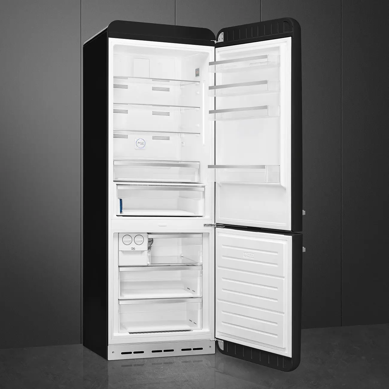 Smeg FAB38RBL5. Capacità netta totale: 481 L. Cerniera porta: Destra. Classe climatica: SN-T, Emissione acustica: 41 dB. Capacità netta frigorifero: 343,7 L, No Frost (frigorifero), Sistema Multi-Airflow (frigorifero), Luce interna. Capacità netta congelatore: 137,7 L, Capacità di congelamento: 8 kg/24h, No Frost (congelatore). Compartimento zona fresca. Classe efficienza energetica: E, Consumo energetico annuo: 321 kWh. Colore del prodotto: Nero