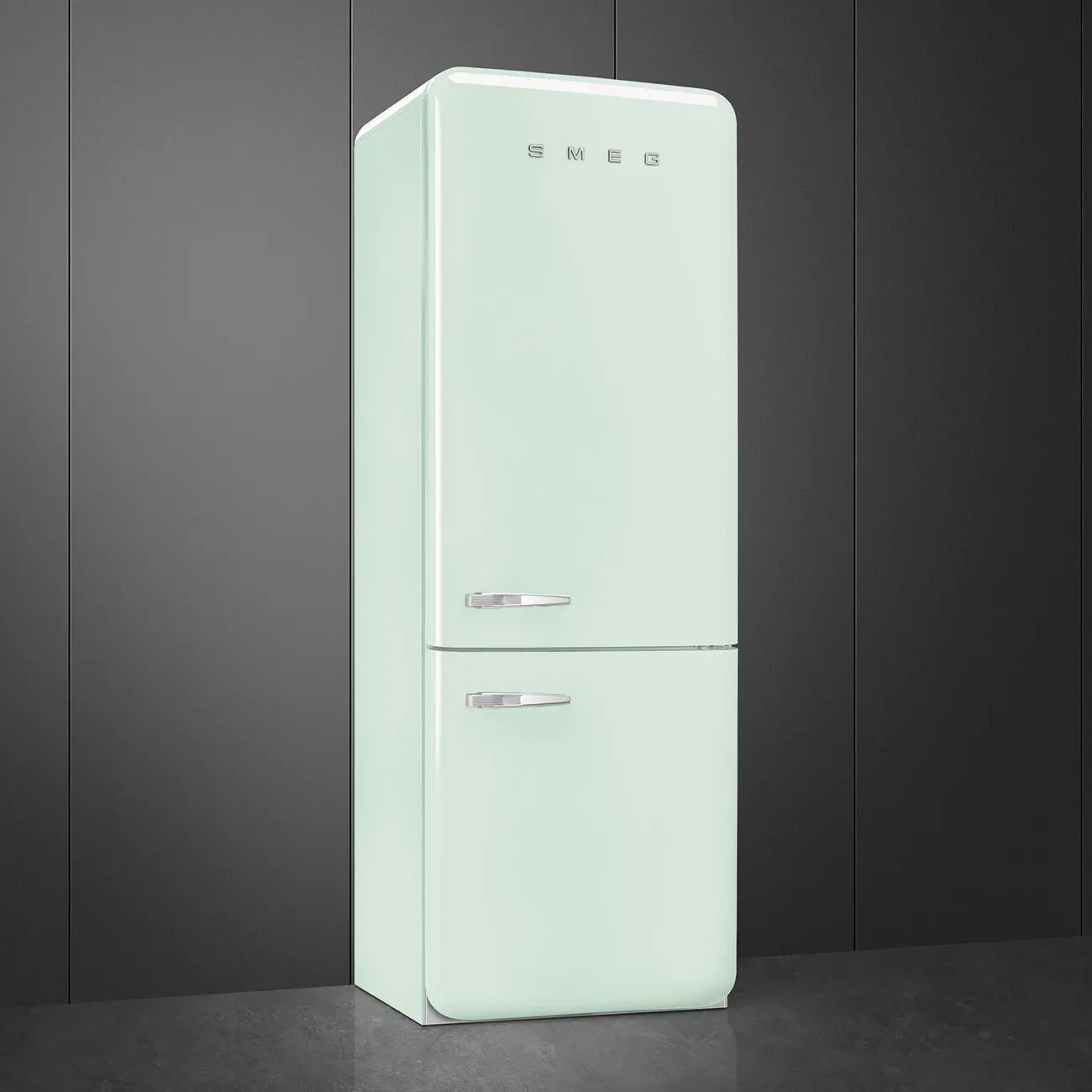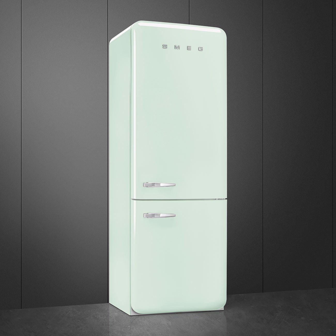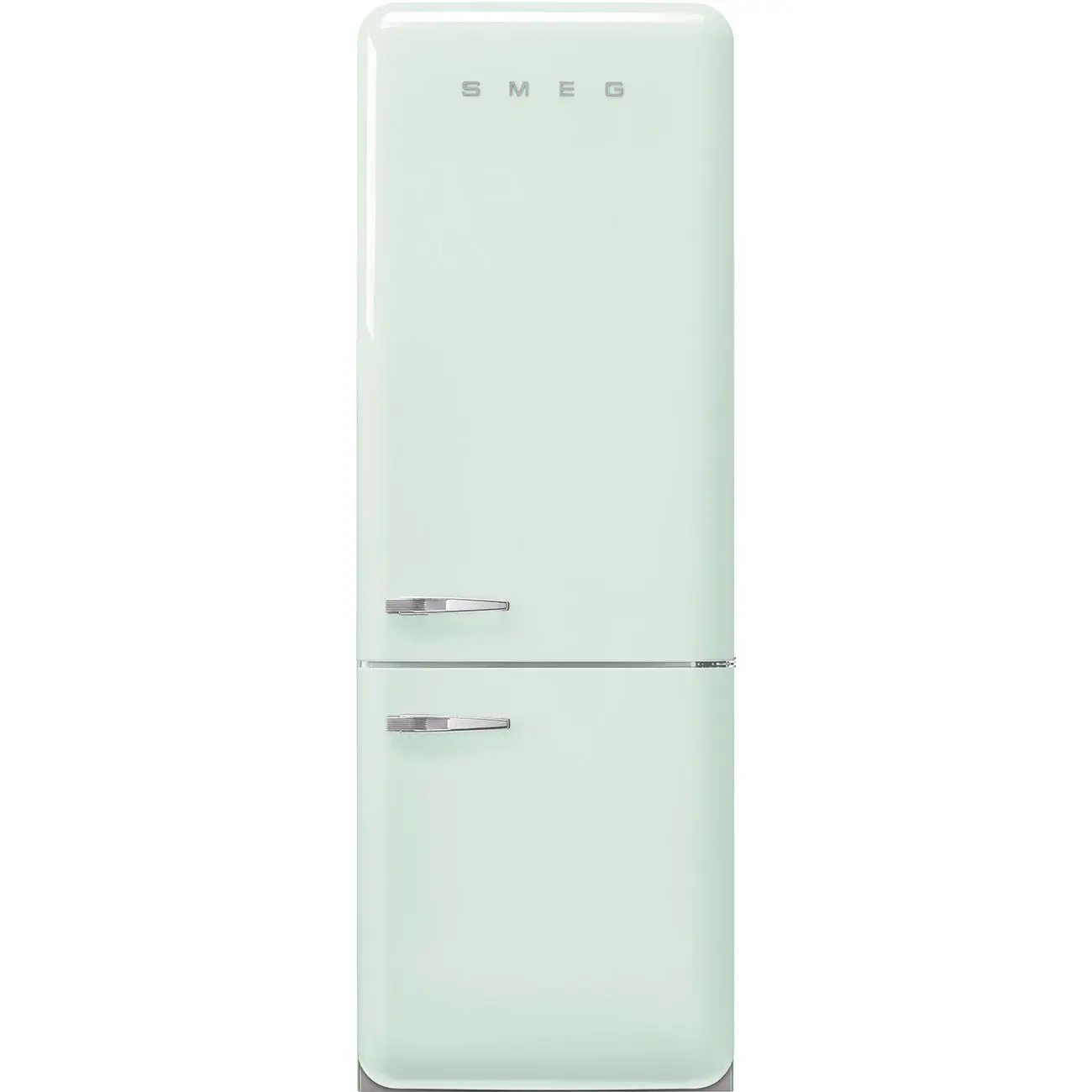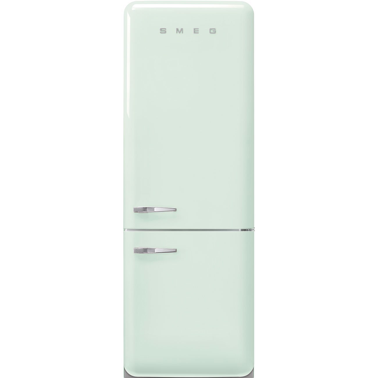 Smeg FAB38RPG5. Capacità netta totale: 481 L. Cerniera porta: Destra. Classe climatica: SN-T, Emissione acustica: 41 dB. Capacità netta frigorifero: 343,7 L, No Frost (frigorifero), Sistema Multi-Airflow (frigorifero), Luce interna. Capacità netta congelatore: 137,7 L, Capacità di congelamento: 8 kg/24h, No Frost (congelatore). Compartimento zona fresca. Classe efficienza energetica: E, Consumo energetico annuo: 321 kWh. Colore del prodotto: Verde