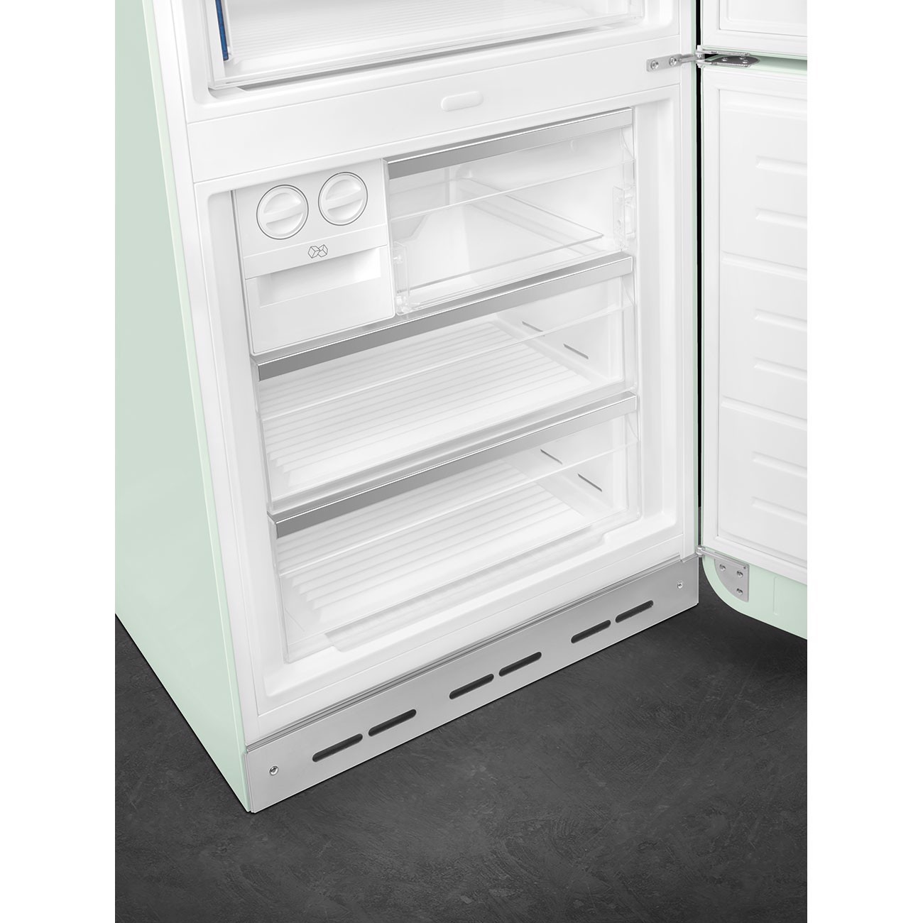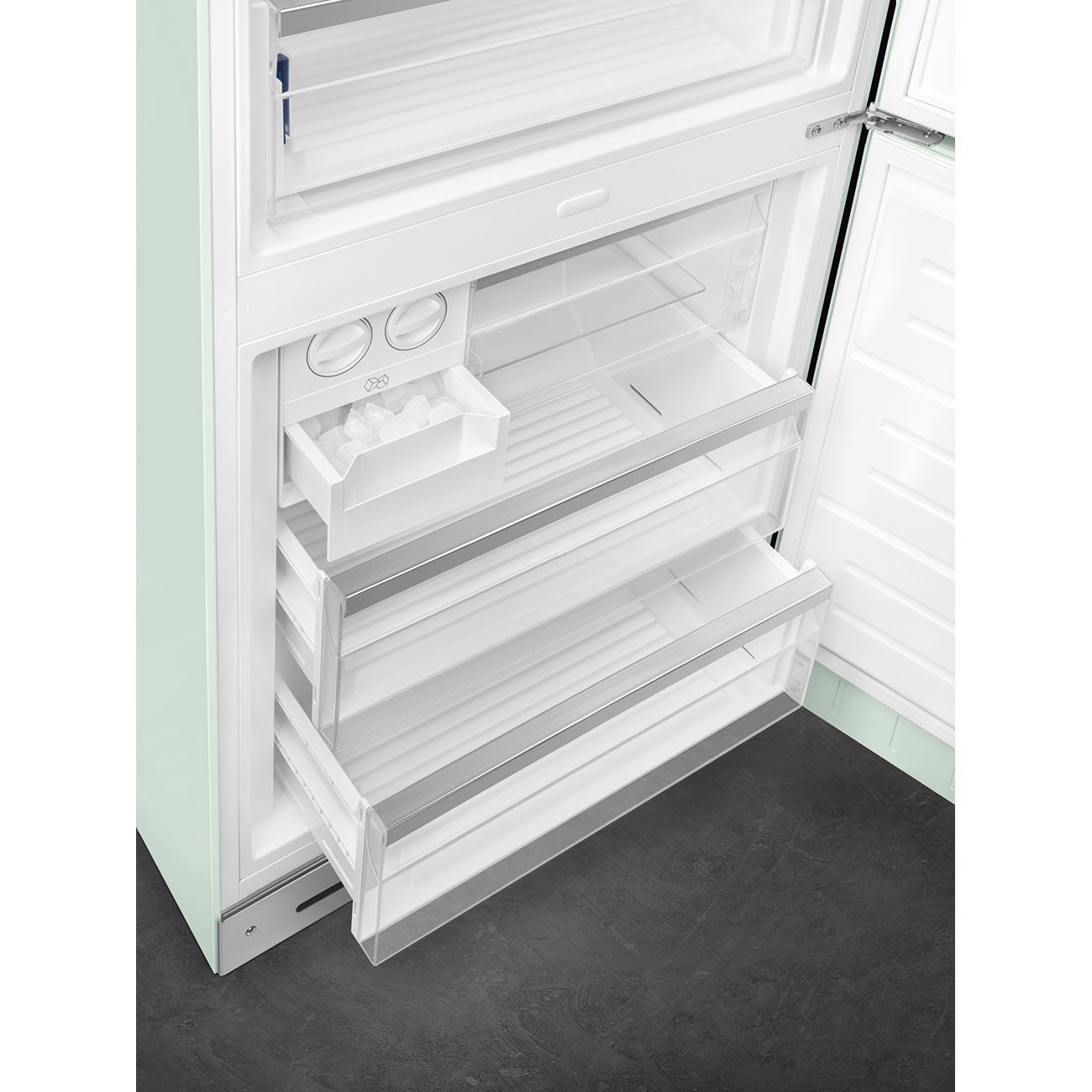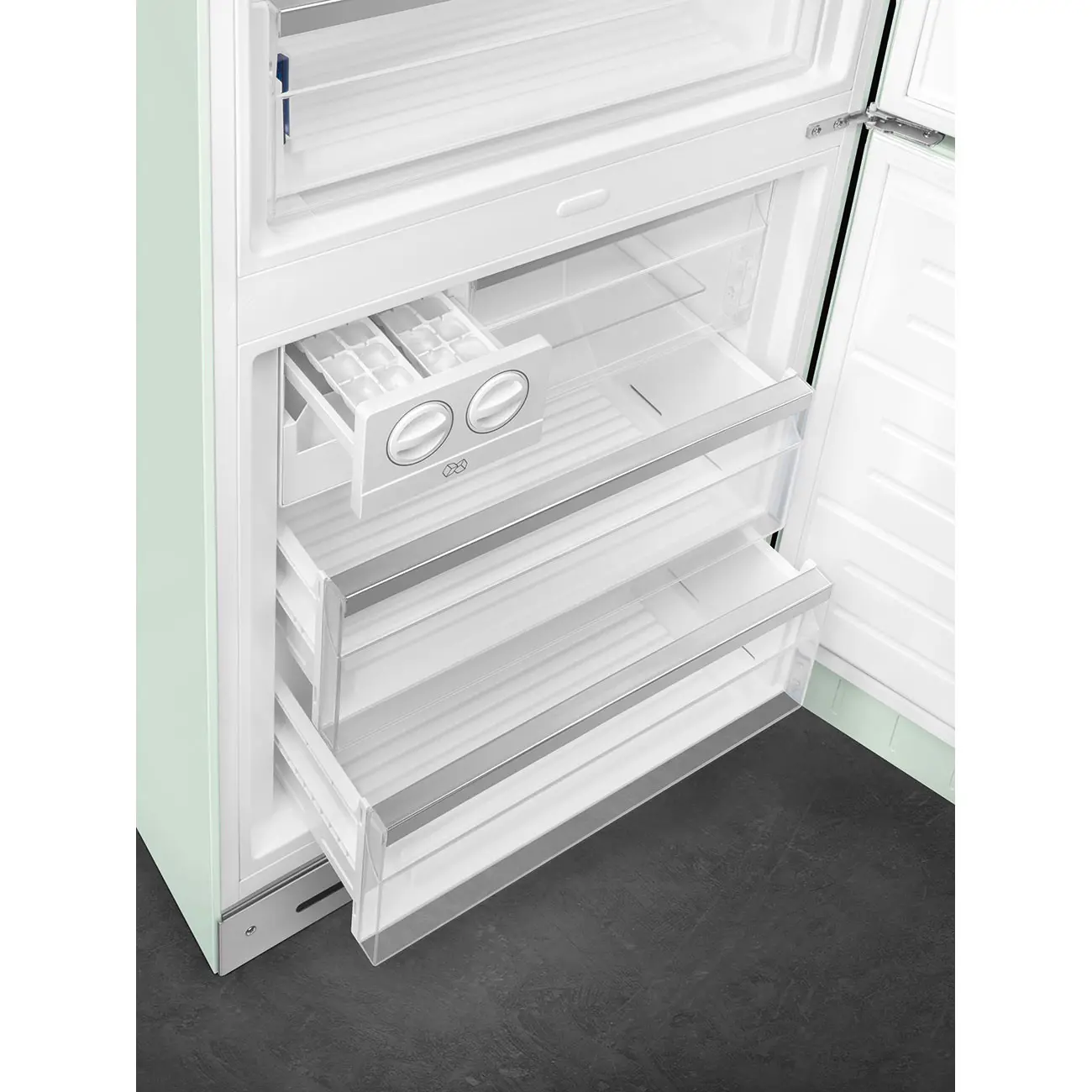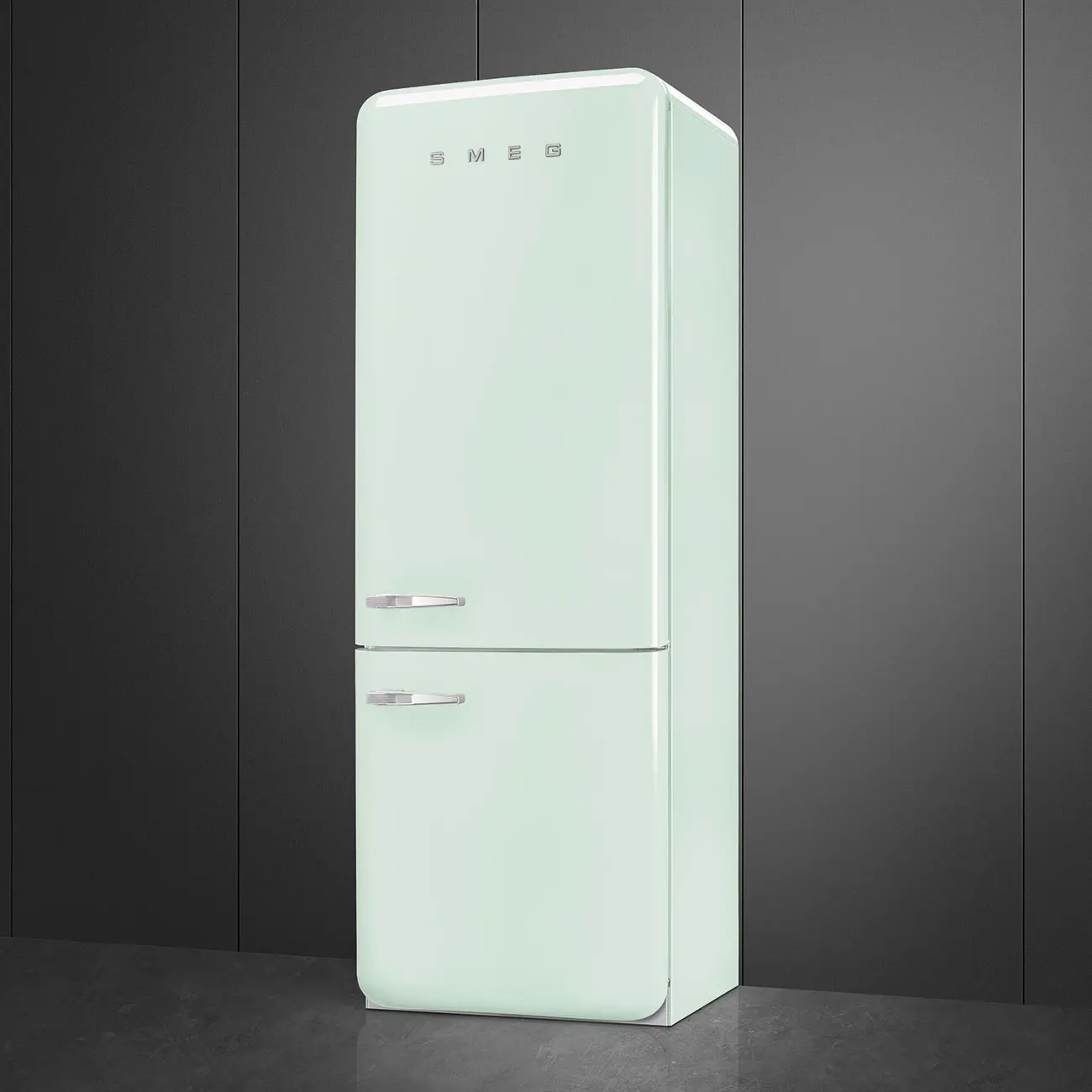Smeg FAB38RPG5. Capacità netta totale: 481 L. Cerniera porta: Destra. Classe climatica: SN-T, Emissione acustica: 41 dB. Capacità netta frigorifero: 343,7 L, No Frost (frigorifero), Sistema Multi-Airflow (frigorifero), Luce interna. Capacità netta congelatore: 137,7 L, Capacità di congelamento: 8 kg/24h, No Frost (congelatore). Compartimento zona fresca. Classe efficienza energetica: E, Consumo energetico annuo: 321 kWh. Colore del prodotto: Verde