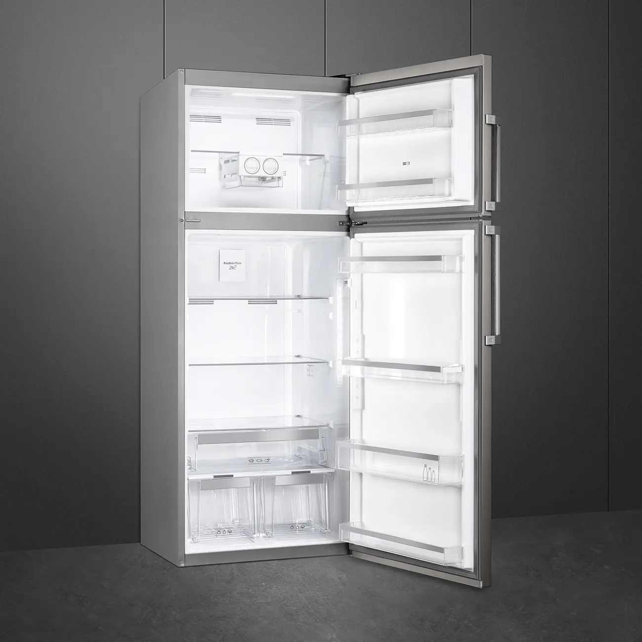 Smeg FD70FN1HX. Capacità netta totale: 432 L. Cerniera porta: Destra. Classe climatica: SN-T, Emissione acustica: 41 dB. Capacità netta frigorifero: 335 L, No Frost (frigorifero), Sistema Multi-Airflow (frigorifero), Luce interna. Capacità netta congelatore: 97 L, Capacità di congelamento: 5 kg/24h, No Frost (congelatore). Compartimento zona fresca. Classe efficienza energetica: F, Consumo energetico annuo: 379 kWh. Colore del prodotto: Acciaio inossidabile