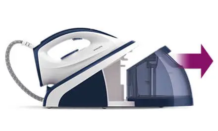 Il serbatoio dell'acqua può essere rimosso e riempito sotto il rubinetto. L'ampia apertura di riempimento ti consente un'operazione veloce e grazie alla capacità di 1,1 l, puoi stirare fino a 2 ore consecutive senza dover aggiungere altra acqua.
