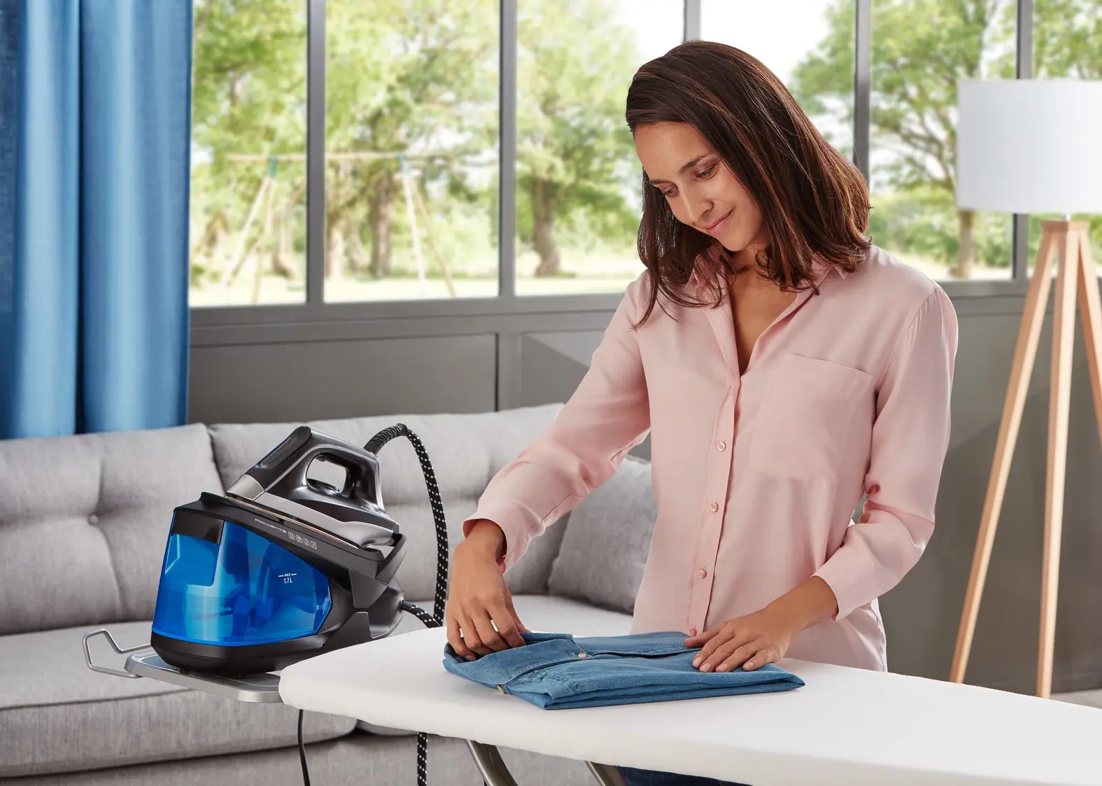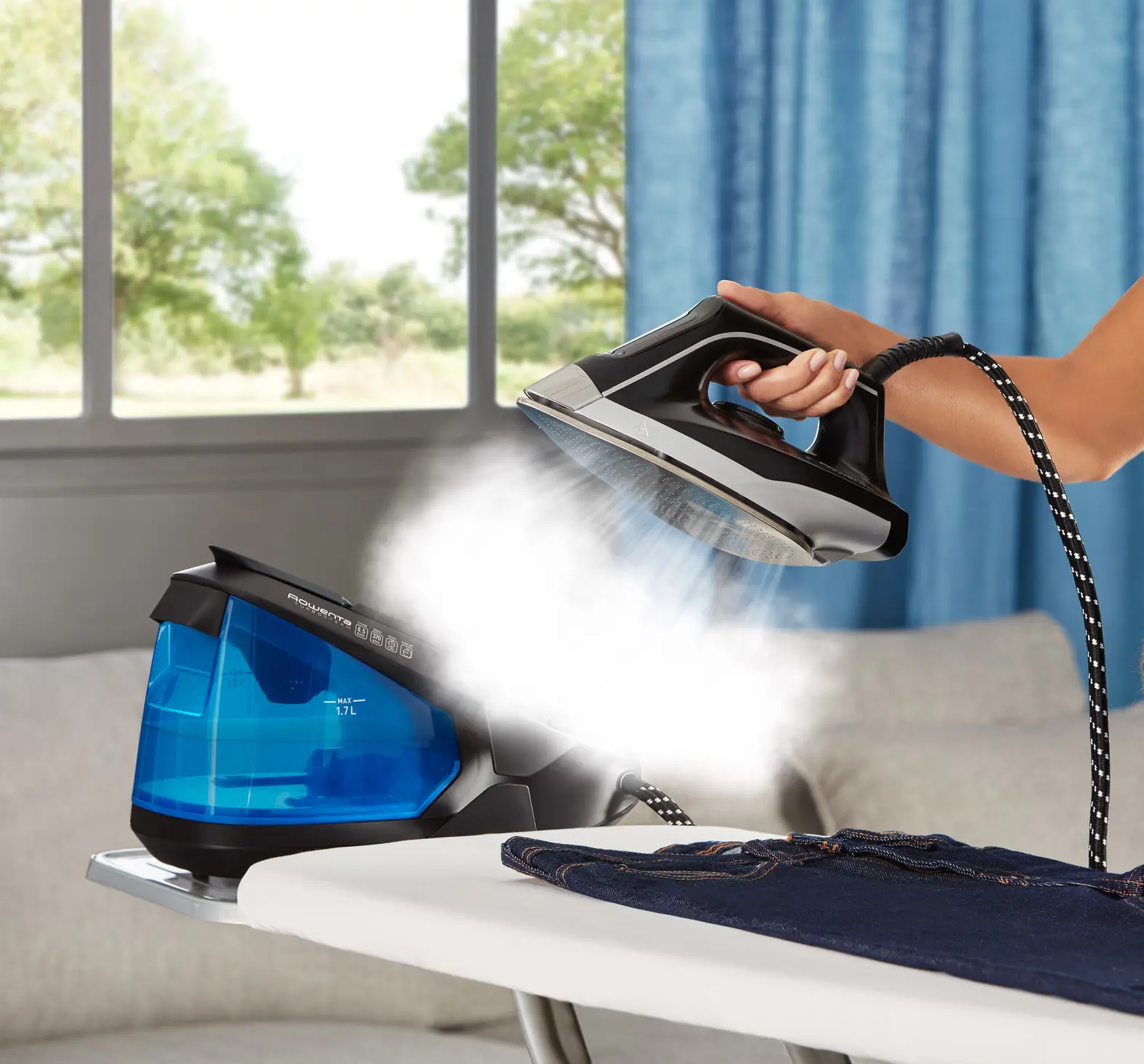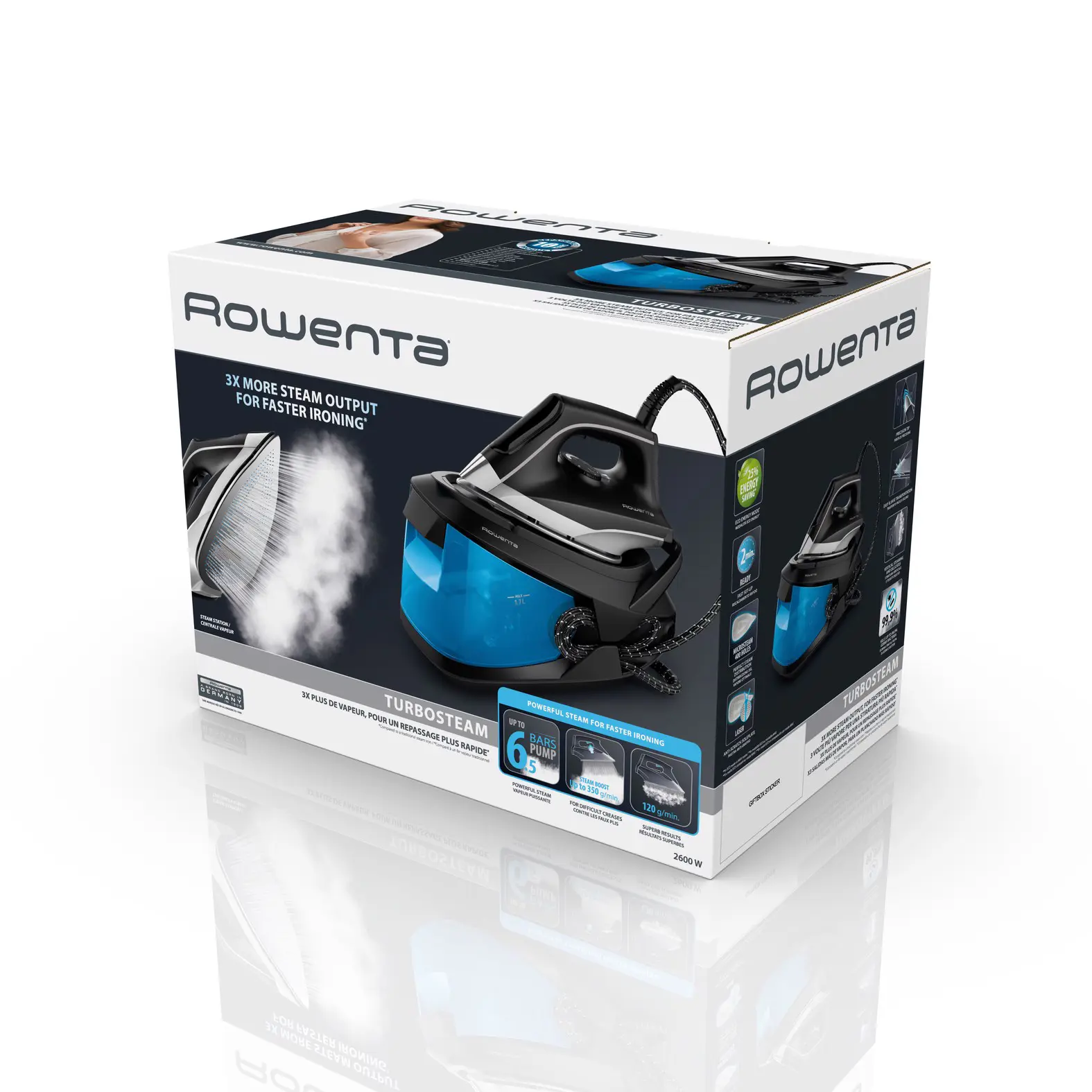 Scopri il set completo del ferro da stiro a vapore: serbatoio dell'acqua amovibile da 1,7 litri per lunghe sessioni di stiratura, pressione della pompa di 6 bar, getto di vapore intenso da 350 g/min per rimuovere le pieghe più ostinate, una piastra di qualità che garantisce la massima distribuzione del vapore e una scorrevolezza impeccabile e molto altro ancora. Tutto questo in una struttura compatta che occupa meno spazio di un normale foglio A4.