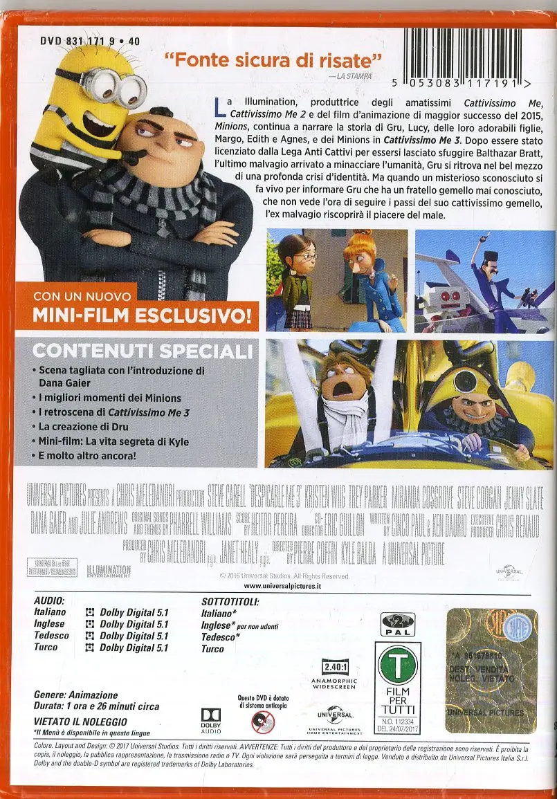 Illumination, il team che ha regalato al pubblico Cattivissimo Me ed i più grandi successi animati del 2013 e del 2015, Cattivissimo Me 2 e Minions, continua a raccontare le nuove avventure di Gru, Lucy, delle adorabili bambine—Margo, Edith ed Agnes—e dei Minions in Cattivissimo Me 3. Dopo essere stato licenziato dalla Lega degli Anti Cattivi per aver fallito nella cattura dell’ennesimo villain che minacciava l’umanità, Gru si ritrova nel bel mezzo di una crisi d’identità. Quando un misterioso sconosciuto si presenta informandolo di avere un gemello perso da tempo—un fratello che spera disperatamente di seguire le orme del cattivissimo gemello—l’ex super-villain riscoprirà quanto sia bello essere cattivi. Max Giusti non solo torna nei panni di Gru, ma si imbarca in un secondo ruolo—quello del fratello gemello Dru. Arisa torna a prestare la sua voce alla super spia Lucy, mentre Paolo Ruffini doppierà il nuovo cattivo Balthazar Bratt, un ex bambino prodigio cresciuto con l’ossessione del malefico personaggio televisivo da lui interpretato negli anni ’80. Bratt, il nemico più formidabile e divertente che Gru abbia mai incontrato, ha intenzione di distruggere Hollywood… e chiunque lo ostacoli.