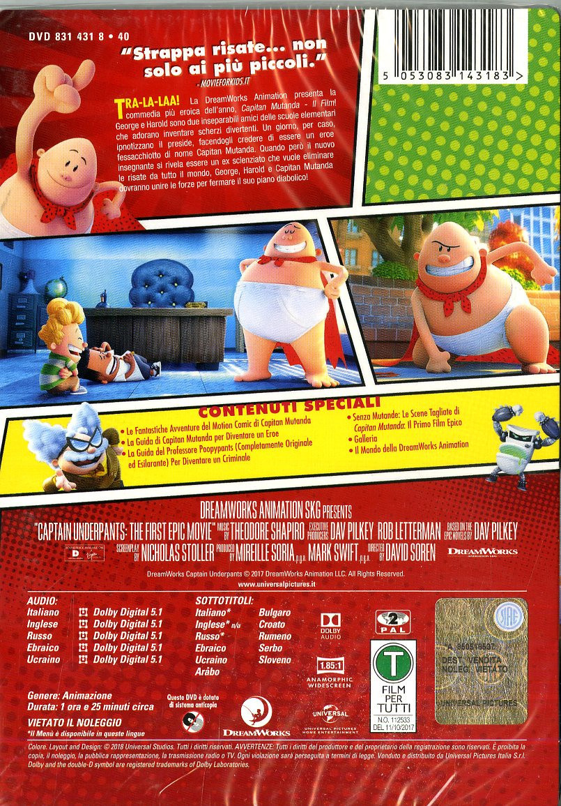Universal Pictures Capitan Mutanda - Il Film, DVD, PG, Animazione, 2D, Inglese, Ebraico, ITA, Russo, Ucraino, Arabo, Bulgaro, Inglese, Ebraico, ITA, Rumeno, Russo, SER, Sloveno, Ucraino