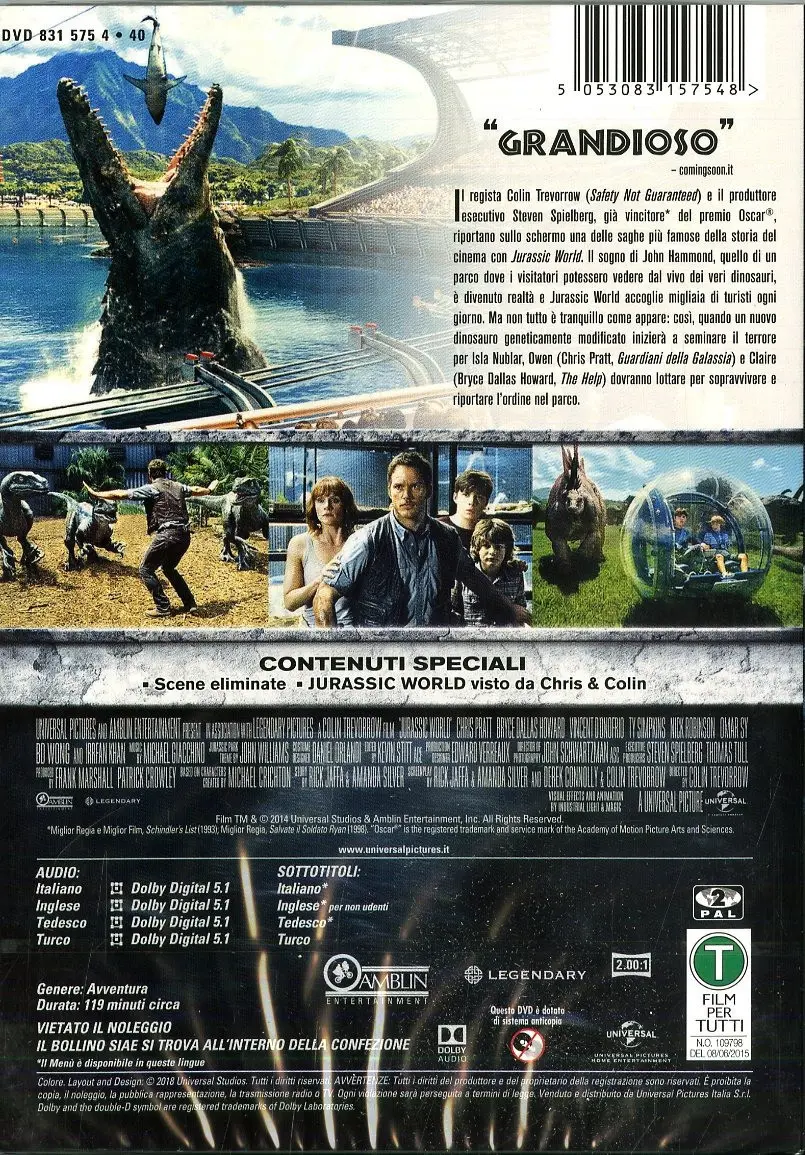 | Cast (attori) | Chris Pratt, Bryce Dallas Howard, Vincent D'Onofrio, Ty Simpkins, Nick Robinson, Omar Sy, BD Wong, Irrfan Khan |