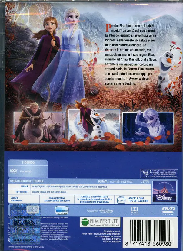 «Ora che Arendelle e la sua famiglia vivono in armonia, Elsa non vorrebbe per nessun motivo turbare la quiete di entrambe, ma sente una voce, che nessun altro ode, che le mostra frammenti del suo passato e le promette risposte riguardo alla sua identità. Per seguire questo richiamo e trovare una spiegazione ai suoi poteri, decide di viaggiare attraverso la foresta incantata di cui le parlava il padre, nonostante questo significhi dover dominare gli spiriti dell’Aria, dell’Acqua, del Fuoco e della Terra. Anna la segue, determinata a proteggere la sorella, e naturalmente Kristoff, Sven e Olaf si uniscono all’impresa.»