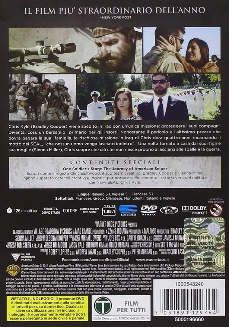 Warner Home Video American Sniper (DVD), DVD, R, Biografia, 2D, Inglese, Francese, ITA, DUT, Inglese, Francese, Greco, ITA