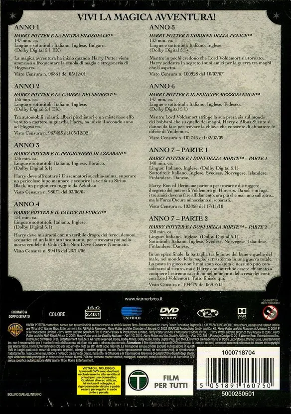 Warner Bros Harry Potter Collezione completa (8 DVD), Film, DVD, 2D, Inglese, ITA, Adulti e bambini, 8 dischi
