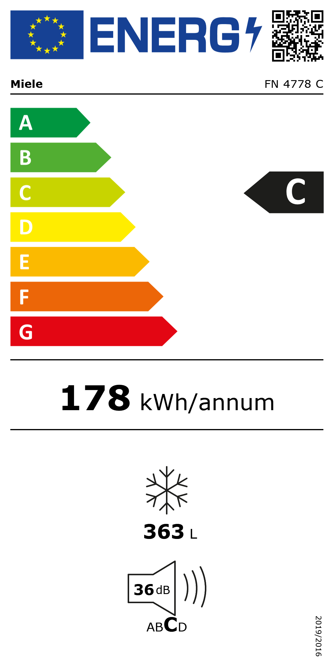 Miele FN 4778 C, 363,2 L, 19 kg/24h, SN-T, Sistema No-frost, C, Bianco