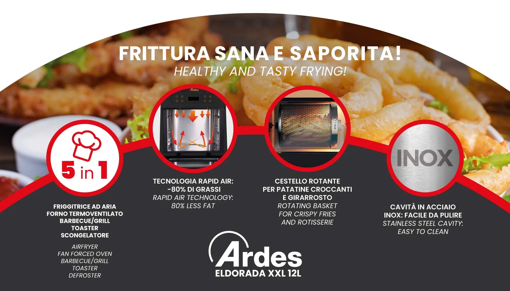 Friggitrice ad aria / forno multifunzione, capacita extra large 12L formato famiglia. 5 in 1: forno elettrico termoventilato, friggitrice ad aria, barbecue / grill, toaster e scongelatore. Pannello comandi touch con display LED. Timer 90 minuti. Temperatura regolabile da 60° a 200°C. 7 programmi di cottura preimpostati per preparare tante gustose ricette, ogni volta con risultati perfetti. Funzione girarrosto. La tecnologia Rapid Air permette di generare un flusso di aria calda in grado di cuocere uniformemente e velocemente un gran numero di piatti. Può cuocere senza olio o con l'80% di olio in meno rispetto a una friggitrice tradizionale. Minor consumo d'olio, minori odori in cucina ma soprattutto meno calorie. Il cestello rotante permette di ottenere perfette patatine croccanti. La rotazione costante del girarrosto combinata con la tecnologia ad aria calda assicura una carne succosa con esterno croccante. Cavita interna in acciaio inossidabile, estremamente facile da pulire. Accessori lavabili in lavastoviglie. Accessori in dotazione: cestello a rete, leccarda, griglia, girarrosto, pinza per girarrosto e guanto forno.