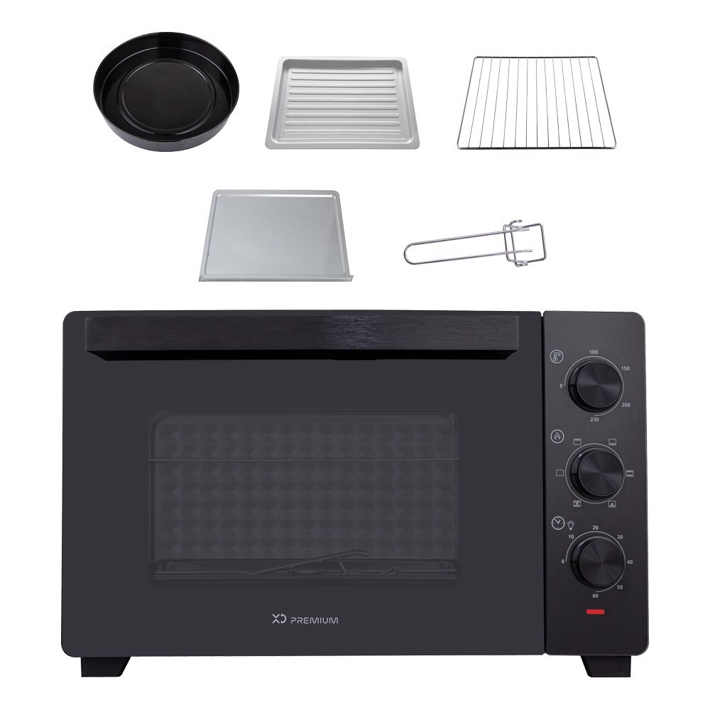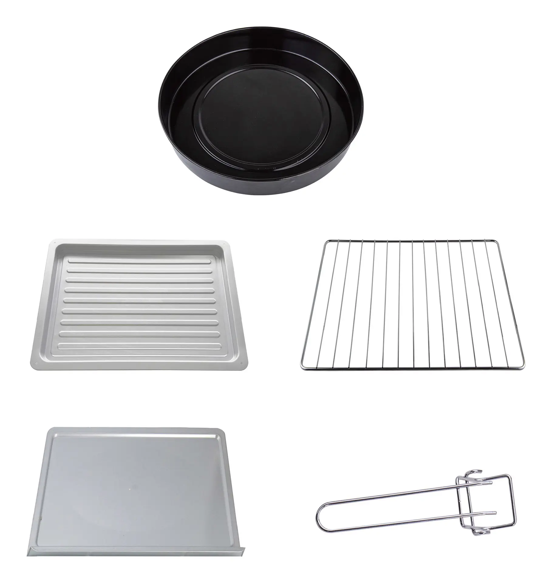 Questo forno elettrico ventilato 48 LITRI include una dotazione completa di accessori pensata per agevolare ogni fase della cottura: una griglia in acciaio, una leccarda rettangolare antiaderente e una teglia tonda da 30 cm, perfetta per pizze, torte salate o dolci da condividere.
