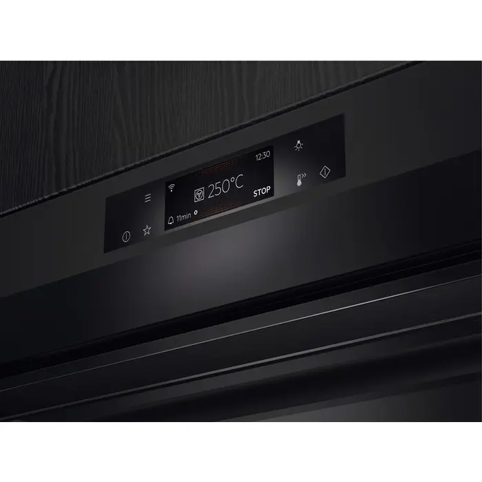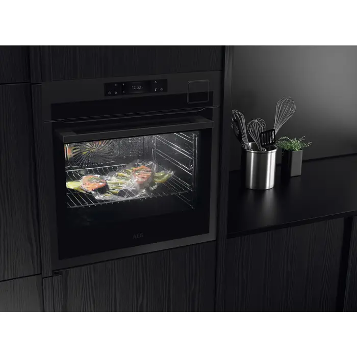 AEG Series 7000 BSE798380T. Dimensione del forno: Media, Tipo di forno: Forno elettrico, Capacità interna forno totale: 71 L. Posizionamento dell'apparecchio: Da incasso, Colore del prodotto: Nero, Tipo di controllo: Touch. Tipo di orologio: Elettronico, Tipo di timer: Digitale, Applicazioni per il controllo supportate: AEG Kitchen. Classe efficienza energetica: A++, Consumo energetico (convenzionale): 0,99 kWh, Consumo energetico (convezione forzata): 0,52 kWh. Quantità lampade: 2 lampada(e), Tipo di lampada: Alogena, posizione delle illuminazioni: Lato, Alto