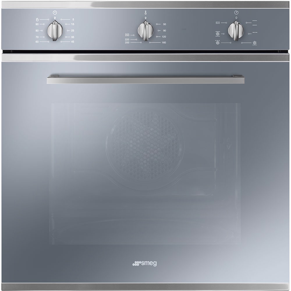 Smeg SF64M3VS. Dimensione del forno: Media, Tipo di forno: Forno elettrico, Capacità interna forno totale: 68 L. Posizionamento dell'apparecchio: Da incasso, Colore del prodotto: Argento, Tipo di controllo: Manopola. Tipo di timer: Meccanico, Modalità di impostazione del timer: Tempo di cottura, Tempo di fine cottura, Timer. Classe efficienza energetica: A, Consumo energetico (convenzionale): 1,15 kWh, Consumo energetico (convezione forzata): 0,8 kWh. Quantità lampade: 1 lampada(e), Tipo di lampada: Alogena, Potenza lampadina: 40 W