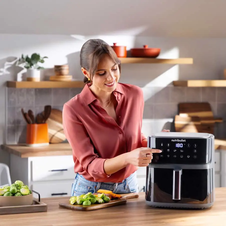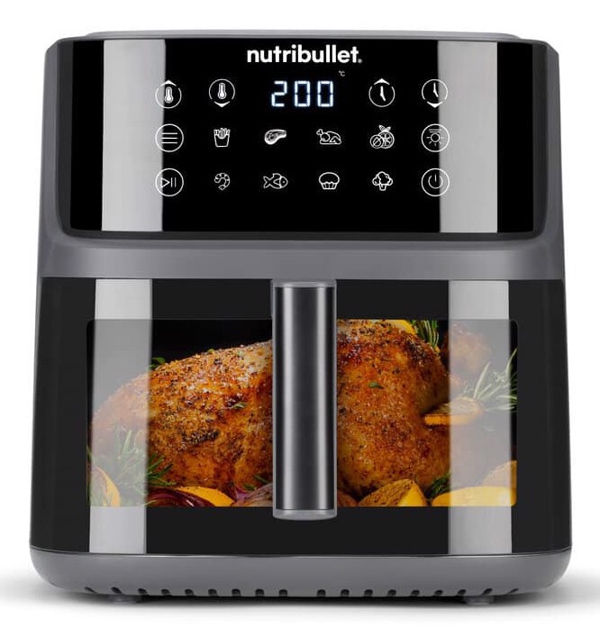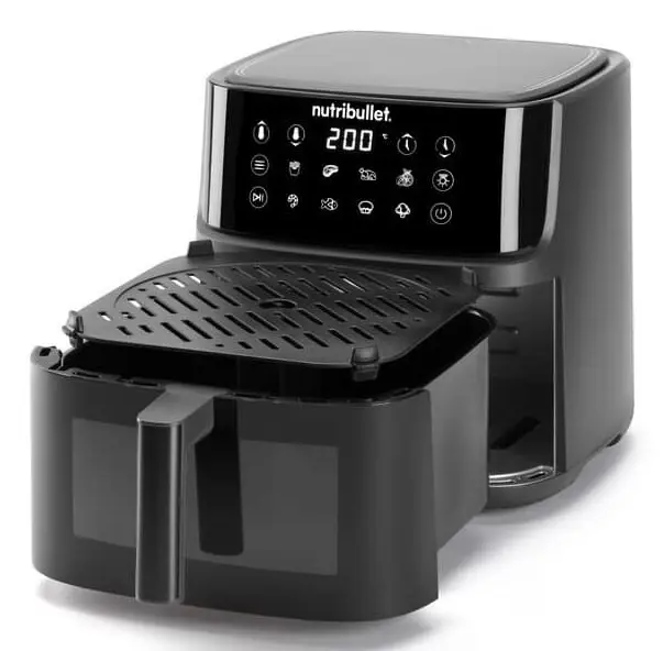 Per preparare pasti caldi, contorni e spuntini basta premere un pulsante con la friggitrice ad aria nutribullet® da 8 litri. Programmata con 8 semplici preimpostazioni, questa versatile friggitrice ad aria facilita la preparazione di patatine, pollo, bistecche, verdure, frutti di mare, crostacei, prodotti da forno, frutta secca e altro ancora. La sua generosa capacità di 8 litri offre lo spazio necessario per preparare qualsiasi porzione, sia che si tratti di arrostire un pollo intero per la famiglia, sia che si tratti di piccole porzioni per una sola persona. La griglia di cottura ha un rivestimento ceramico antiaderente privo di PFAS, per cucinare in maniera piu sana senza l'uso di sostanze chimiche nocive.. Inoltre, è incredibilmente efficiente, grazie alla tecnologia di convezione a vortice a 360° che riduce i tempi e la quantità di olio (e il disordine) necessari per rendere i tuoi piatti gustosi.