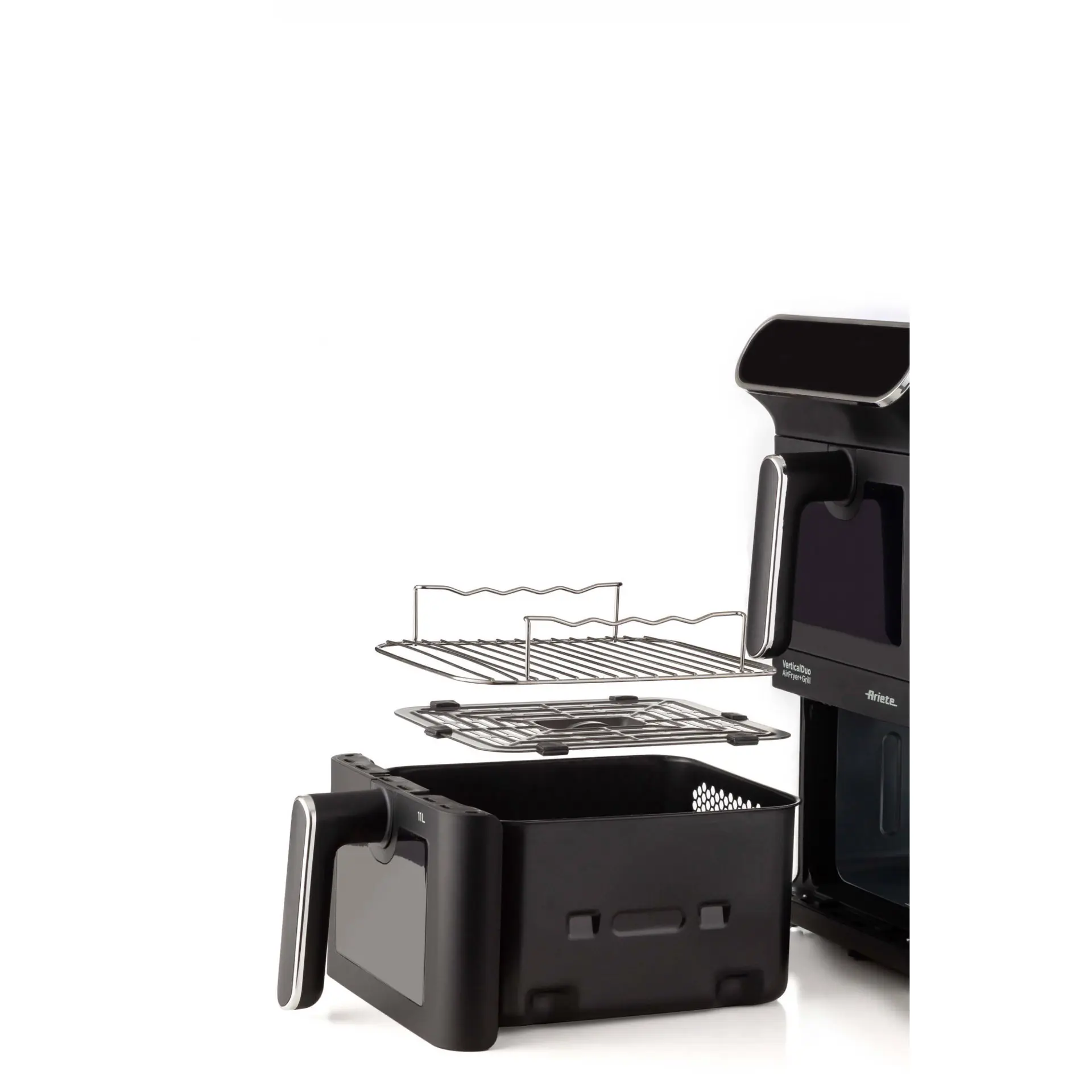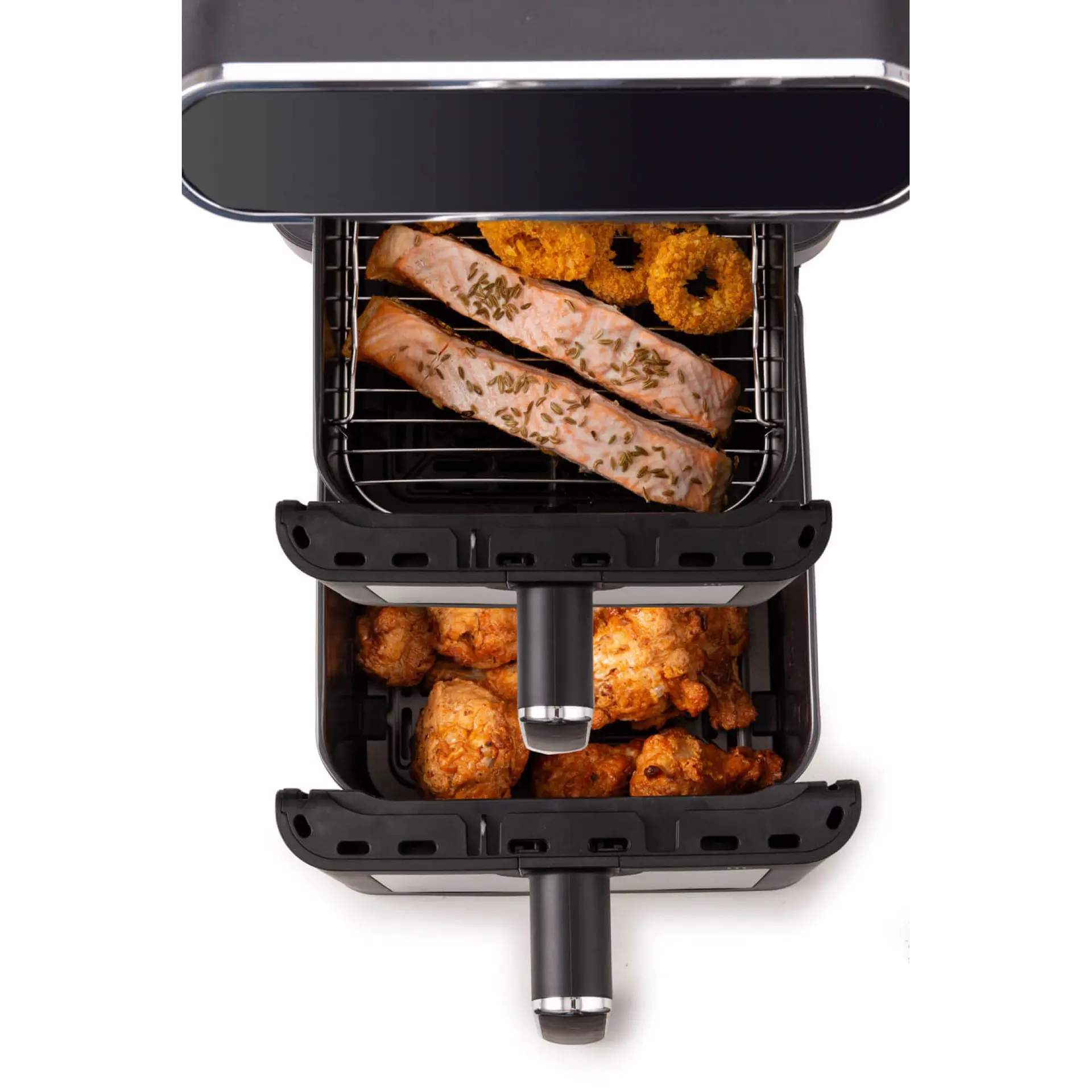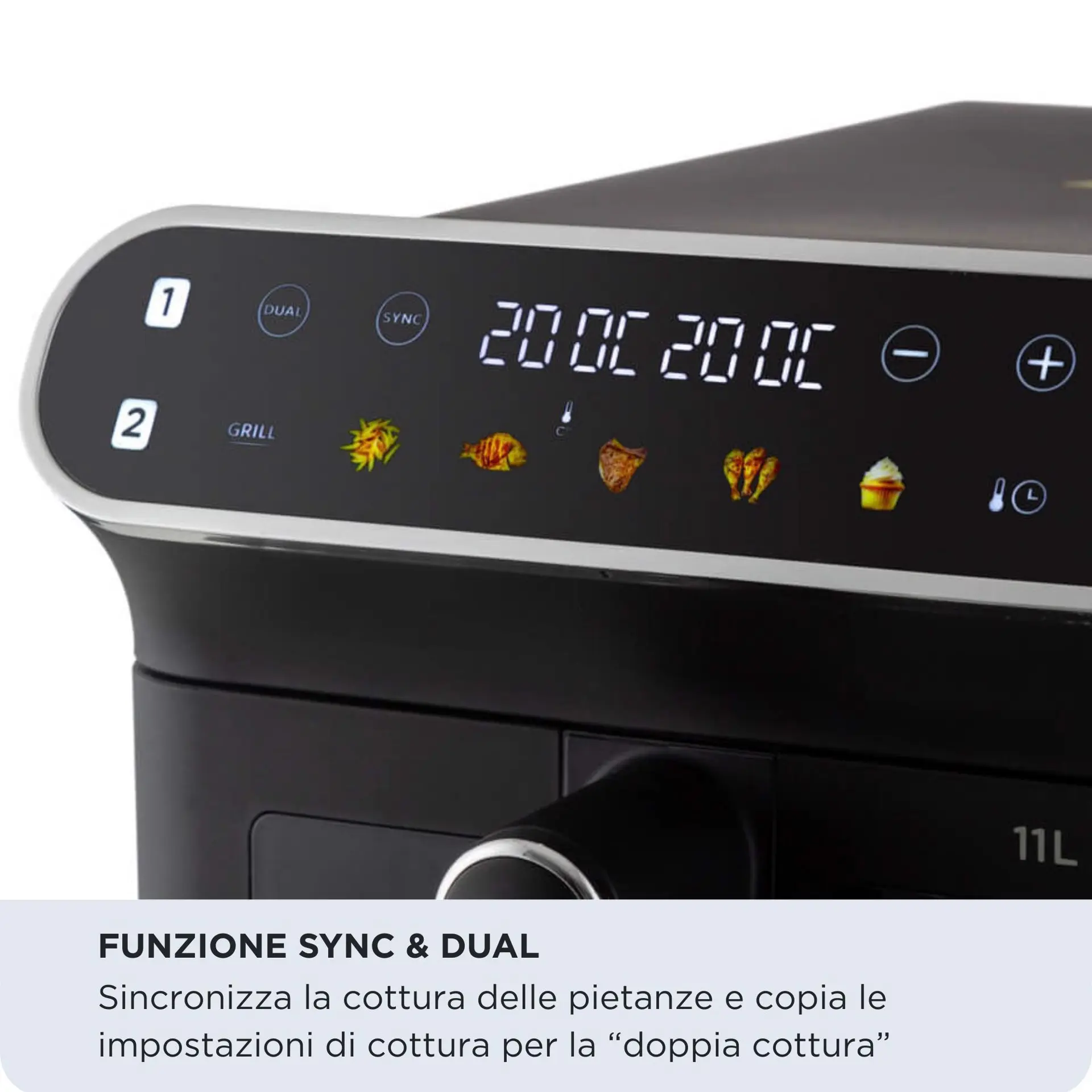 Sogni di preparare una cena completa per tutta la famiglia senza dover accendere il forno tradizionale e aspettare ore?Air Fryer Vertical Duo è la friggitrice ad aria doppia verticale che con il suo innovativo design a "torre", ti offre una capacità di 11 Litri occupando il 40% di spazio in meno nella tua cucina rispetto alle classiche friggitrici a doppio cestello orizzontali. E’ come avere due forni, uno sopra l’altro. Con soli 26 cm di larghezza si infila in qualsiasi angolo, lasciandoti spazio libero per tagliare, impastare e creare rispetto alle tradizionali friggitrici ad aria orizzontali. I due cestelli da 5,5L (11L totali) permettono di cucinare su 4 livelli di cottura contemporaneamente sulle apposite griglie.Air Fryer Vertical DUO dispone di 2 funzioni intelligenti: Funzione SYNC: Sincronizza la fine del tempo di cottura. Anche se i due cestelli hanno tempi e temperature diverse, la friggitrice farà in modo che tutto sia pronto nello stesso istante. Niente più cibo freddo in tavola!Funzione DUAL: Copia le impostazioni su entrambi i cestelli per grandi quantità dello stesso piatto, ideale per famiglie numerose!Grazie alle ampie finestre trasparenti e la luce interna avrai pieno controllo sulla cottura delle tue pietanze. Con Air Fryer Duo è possibile preparare grandi quantità di cibo: riesce a cuocere un pollo intero fino a 1,5kg. Inoltre è un’ottima soluzione per essiccare gli alimenti grazie alla temperatura regolabile da 60 fino a 200 gradi.